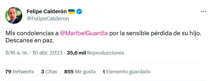 El expresidente de México, Felipe Calderón Hinojosa, expresó sus condolencias a la actriz y cantante Maribel Guardia por el fallecimiento de su hijo, Julián Figueroa.La noche de este lunes se informó sobre la muerte del también cantante y actor, quien además es hijo del compositor Joan Sebastian, fallecido hace ocho años."Mis condolencias a Maribel Guardia por la sensible pérdida de su hijo. Descanse en paz", escribió el expresidente de México en redes sociales.Maribel Guardia explicó a través de una publicación en Instagram que Julián fue hallado sin vida en su cuarto."Lo encontraron inconsciente esta noche en su cuarto, mientras yo estaba en el teatro. Llamaron al 911 y cuando llegó la ambulancia y la policía lo encontraron ya sin vida, sin rastro de violencia alguno. El parte médico indica que falleció por un Infarto agudo al miocardio y fibrilación ventricular", detalló.JM