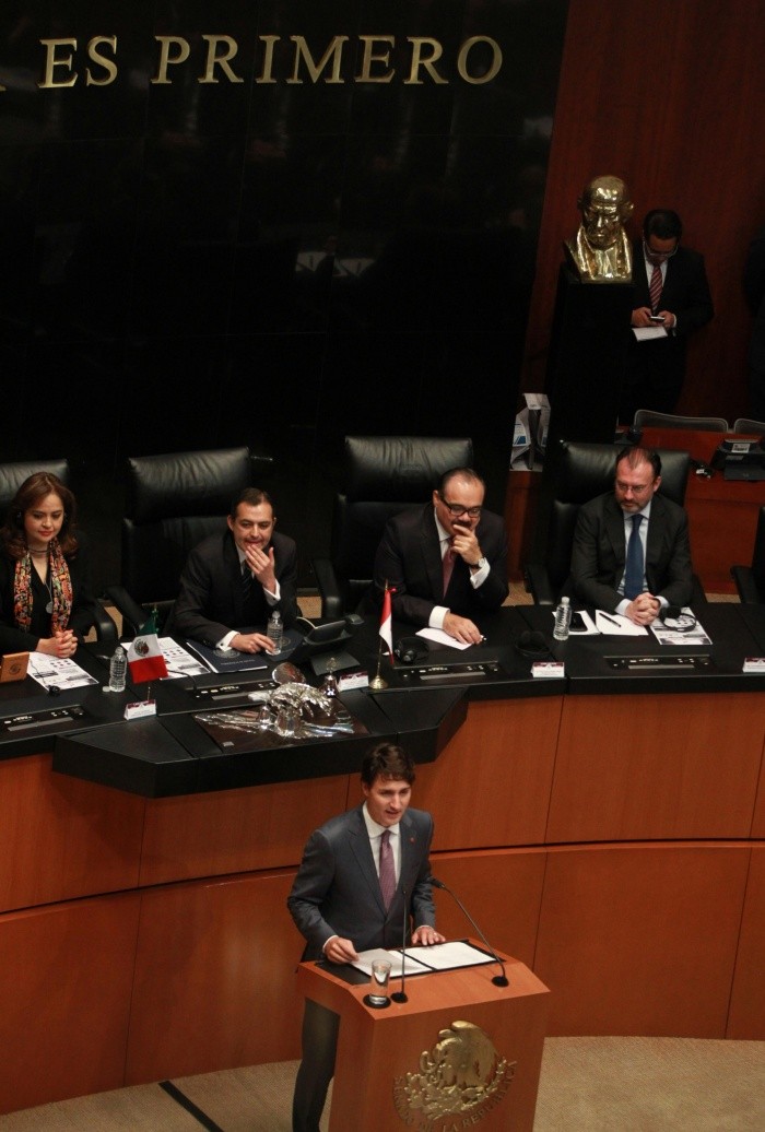 El primer ministro de Canadá, Justin Trudeau, afirmó que aún queda mucho por hacer en materia de derechos humanos y pidió a los legisladores luchar por mejores empleos para la clase media, así como de las mujeres y de las niñas."México y Canadá tienen una visión compartida del progreso", dijo durante su mensaje que pronunció en el Senado, en el que reiteró su apoyo a los mexicanos, luego de los sismos del 7 y 19 de septiembre pasado.Desde la tribuna de la Cámara alta y en español, Trudeau aseguró que "el respeto al derecho ajeno es la paz", frase del Benemérito de las Américas, Benito Juárez.El primer ministro de Canadá, Justin Trudeau, fue aclamado por el pleno del Senado de la República, en sesión solemne, en la cual expresó su voluntad porque las negociaciones de la modernización de TLC de América del Norte culmen exitosamente.Trudeau levantó de sus escaños al pleno, particularmente cuando expuso su decisión de impulsar los derechos de las mujeres y los niños, y al subrayar la importancia de la política de género en los países de la región América del Norte.En sesión solemne, el canadiense destacó que en la modernización del TLCAN se debe incluir también la protección laboral, con reglas progresistas.Dijo que alcanzar la meta de ganar-ganar-ganar, necesita mejores condiciones de trabajo y salarios.A la sesión solemne abierta para recibir al premier canadiense asistieron el presidente de la Cámara de Diputados, Jorge Carlos Ramírez Marín; los secretarios de Relaciones Exteriores, Luis Videgaray Caso y de Economía, Ildefonso Guajardo Villarreal.El presidente del Senado, Ernesto Cordero Arroyo, dijo a Trudeau que "juntos somos más fuertes", y en la región América del Norte, "la suma es mayor que sus partes", y exhortó a que "reforcemos la alianza a un futuro mejor".Cordero Arroyo, a favor del progreso de las negociaciones del TLC, destacó la importancia de que se promueva una mayor movilidad laboral, en la región.