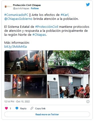 Una persona muerta y más de mil evacuados en el norte de Chiapas han dejado hasta este momento las lluvias de la depresión tropical "Karl", informó el sistema estatal de Protección Civil.En el municipio de Pichucalco, diversas corporaciones de rescate y ayuda evacuaron de manera preventiva a más de mil lugareños que se encontraban en actividades religiosas debido al incremento de los niveles del río Pichucalco.Ahí mismo fue rescatado con vida el niño Rubén Alfredo, de siete años de edad, quien se reportó por unos momentos como desaparecido.En otra acción, fueron evacuadas 40 familias, un aproximado de 120 personas, tras el desbordamiento del arroyo "El Cristo", que provocó inundaciones de hasta tres metros de altura en, al menos cinco colonias, principalmente en la zona centro.Durante el crecimiento súbito de dicho arroyo, una persona de 65 años de edad quedó atrapada dentro de su vivienda. Fue rescatada con vida y trasladada a un hospital en condición grave. Más tarde falleció.En el municipio se mantienen activos dos refugios temporales donde se atiende a las familias con alimentación y techo.Otras evacuaciones preventivas fueron en el municipio de Ixtacomitán, a causa del desbordamiento de arroyos, que afectó viviendas de los barrios San Sebastián, Catarina 1a. Sección y Nicolás Bravo 2a Sección. En éste último se rescató a una persona.Además, en el municipio de Ostuacán fueron evacuadas 35 familias por el desbordamiento del río Magdalena.Las lluvias dañaron también el tramo carretero Pichucalco-Juárez, a la altura del kilómetro 9, conocido como Loma Raspada, donde el colapso de la superficie de rodamiento incomunica la vía.El puente conocido como ciudad rural Ostuacán-Sayula colapsó e incomunica el tramo. En el municipio de Sunuapa, colapsó el puente vehicular Platanar sobre el río del mismo nombre.Los remanentes de "Karl" mantendrán lluvias torrenciales e intensas y podrían presentar deslaves, deslizamientos de laderas, desbordamiento de ríos y arroyos o afectaciones en caminos y tramos carreteros.También se prevén inundaciones en zonas bajas y saturación de drenajes en sitios urbanos. Se recomendó a la población extremar precauciones y permanecer atenta a los llamados de Protección Civil y de las autoridades estatales y municipales.JM