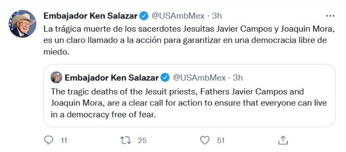 El embajador de Estados Unidos en México, Ken Salazar, señaló que el asesinato de dos sacerdotes jesuitas en Chihuahua es un llamado a garantizar una democracia sin miedo. "La trágica muerte de los sacerdotes Jesuitas Javier Campos y Joaquín Mora, es un claro llamado a la acción para garantizar una democracia libre de miedo", expresó en su cuenta de Twitter.En un mensaje posterior, escribió: "luchamos por honrar su legado defendiendo los pilares de la democracia de FDR: libertad de expresión, libertad de credo, libertad de desear y libertad de vivir sin miedo… en todo el mundo".Los sacerdotes Javier Campos y Joaquín Mora fueron asesinados el 21 de junio pasado, en la comunidad de Cerocahui, Chihuahua. A más de un mes de estos hechos, no se ha detenido al responsable, identificado como "El Chueco".JM