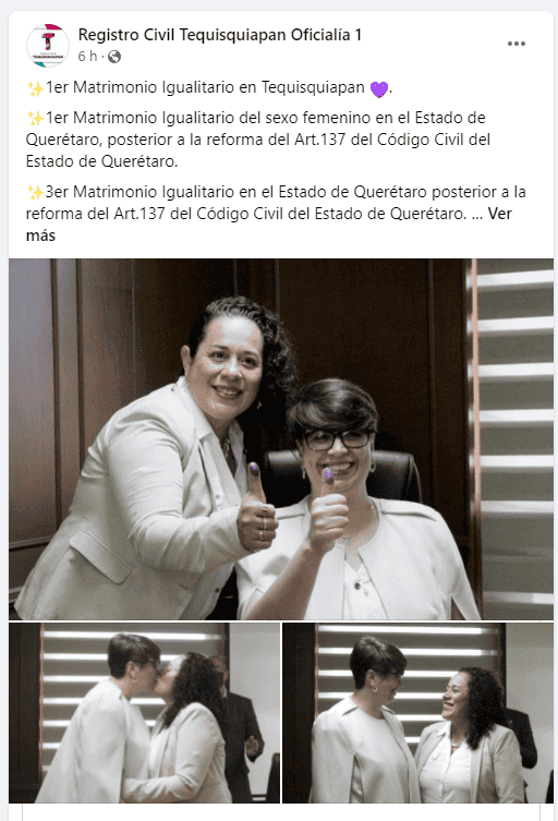 "Esta mañana en Tequis se hizo historia con el primer matrimonio igualitario como resultado de la reforma del Artículo 137 del Código Civil del Estado de Querétaro. Sin duda este evento es un gran precedente en materia de Derechos Humanos, enhorabuena a las ahora esposas", es el mensaje publicado por el Registro Civil de Tequisquiapan.