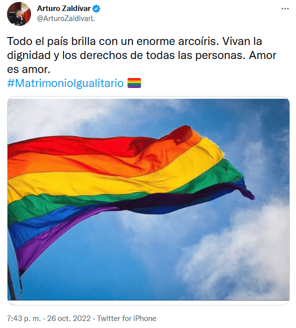 Luego de que este miércoles se aprobó en el Congreso de Tamaulipas el matrimonio entre personas del mismo sexo, el ministro presidente de la Suprema Corte de Justicia de la Nación (SCJN), Arturo Zaldívar, celebró que ya es legal en todo México.A través de sus redes sociales, Zaldívar expresó que "todo el país brilla con un enorme arcoíris"."Vivan la dignidad y los derechos de todas las personas. Amor es amor", escribió el ministro presidente de la SCJN.Con gritos de "¡Sí se pudo, sí se pudo!", integrantes de la comunidad LGBT+ celebraron la tarde de ayer en el Congreso del Tamaulipas la aprobación del matrimonio entre personas del mismo sexo.A pesar de que Tamaulipas fue el último estado en avalar la legislación sobre matrimonios igualitarios, ahora en las 32 entidades del país será posible ejercer este derecho sin necesidad de recurrir a un amparo.Este miércoles, el Congreso estatal aprobó las reformas al artículo 132 del Código Civil para el estado, para reconocer el derecho al matrimonio entre personas del mismo sexo, en una votación en la que 23 diputados votaron a favor, 12 en contra y solo hubo una abstención.OA