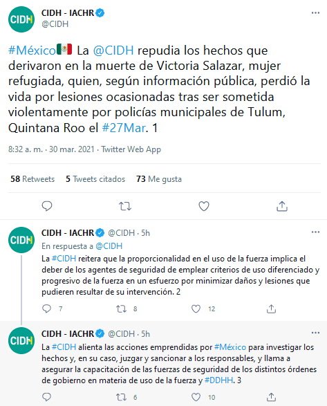 La Comisión Interamericana de Derechos Humanos repudió la muerte de una mujer salvadoreña a manos de policías en Tulum, Quintana Roo, llamando a las autoridades mexicanas a asegurar la capacitación de sus uniformados en el uso de la fuerza."La CIDH repudia los hechos que derivaron en la muerte de Victoria Salazar, mujer refugiada, quien, según información pública, perdió la vida por lesiones ocasionadas tras ser sometida violentamente por policías municipales de Tulum", dijo en Twitter.Salazar, de 36 años, murió el sábado en Tulum tras ser detenida por la policía luego de un altercado con el encargado de una tienda de víveres.En un video divulgado en redes sociales, se observa a uno de los policías colocando su rodilla sobre la espalda de Victoria, mientras ella yace con el rostro hacia el pavimento."La CIDH alienta las acciones emprendidas por México para investigar los hechos y, en su caso, juzgar y sancionar a los responsables, y llama a asegurar la capacitación de las fuerzas de seguridad de los distintos órdenes de gobierno en materia de uso de la fuerza y derechos humanos", agregó la Comisión, ente autónomo de la OEA.La muerte de Salazar ha sido comparada con la del afroestadounidense George Floyd, fallecido bajo la rodilla de un un policía blanco durante su arresto en mayo de 2020, un caso que causó conmoción mundial y desató una ola de protestas contra la brutalidad policial y la discriminación.GC