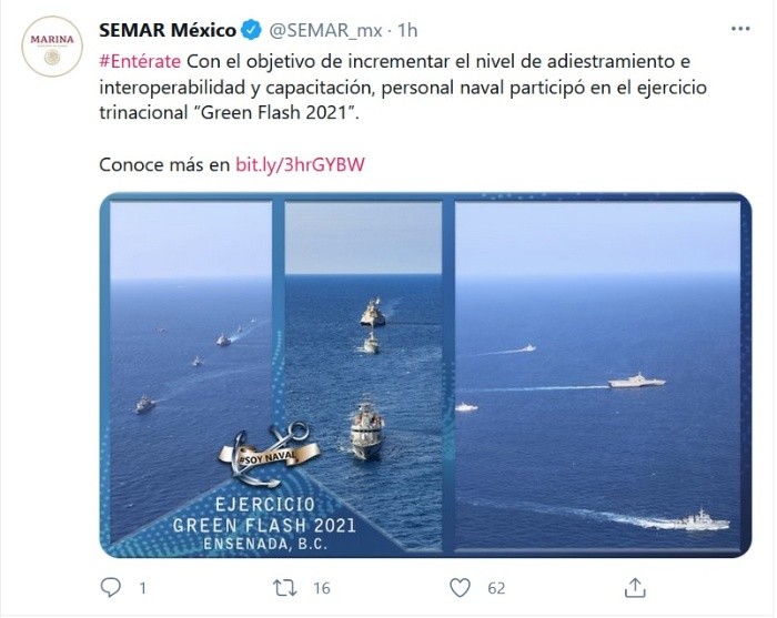 México, Estados Unidos y Canadá realizaron el jueves la operación naval conjunta "Green Flash 2021" frente a las costas de Ensenada, Baja California, con el objetivo de prevenir y disuadir actividades ilegales en la Zona Económica Exclusiva (ZEE).La Armada de México, la Fuerza Armada y Guardia Costera de Estados Unidos, así como la Marina Real de Canadá, desarrollaron formaciones y maniobras navales entre los buques, además realizaron ejercicios de anaveaje y despegue de helicóptero en las cubiertas de vuelo de los navíos.La Secretaría de Marina (Semar) informó que el propósito de la operación es la prevención, disuasión, disrupción e interdicción de actividades ilegales en la Zona Económica Exclusiva (ZEE), por medio de la conducción de operaciones marítimas, intercambio de información y sincronización, junto con la implementación de procedimientos normalizados para las unidades navales y centros de operaciones de las agencias participantes.Con estos ejercicios navales, indicó la dependencia, el personal de la Armada de México incrementa su nivel de adiestramiento e interoperabilidad y capacitación, para mantener el estado de Derecho en la mar.Por parte de la Secretaría de Marina participó la segunda flotilla de unidades de superficie con la Patrulla Oceánica ARM “Revolución” PO-164 y un helicóptero ANX Panther, perteneciente al Escuadrón Aeronaval ESCAN-221; de la Armada de Estados Unidos, el buque USS Coronado (LCS-4); de la Guardia Costera de EU, el buque USCG Robert Ward (WPC-1130) y un helicóptero MH-60J JayHawk; y de la Marina Real canadiense los buques HMCS Brandon (MM-710) y HMCS Saskatoon (MM-709).JM