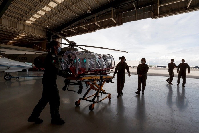 Con camillas cápsula, respiradores y limpieza extrema, la tripulación de las cinco ambulancias aéreas de la Secretaría de Marina buscar salvar vidas de pacientes de COVID-19 que trasladan a centros médicos en sus misiones por todo México.Eduardo Vargas es teniente de navío de la Secretaría de Marina (Semar) y, aunque lleva seis años realizando traslados de pacientes en ambulancias aéreas, siente especialmente satisfactorio poder ayudar a la población civil y enfermos por coronavirus."Es gratificante hacer este tipo de operaciones. Se apoya al pueblo mexicano, a toda la población en general sin ninguna inferencia en que sea únicamente un tipo de personas. (...) La Semar está para velar por el bienestar del pueblo mexicano en todo momento", explicó este miércoles el piloto aviador.Hasta el momento se han realizado 26 viajes en el denominado Plan Marina.La ambulancia aérea es un servicio que presta la institución desde el año 2000 para realizar el traslado de personas con situaciones de salud delicadas y actualmente se trabaja en apoyo al sector salud mexicano ante la contingencia sanitaria por la COVID-19.Aunque el teniente Vargas apenas tiene contacto con el enfermo, su trabajo cambió desde que iniciaron los viajes por la pandemia a finales de febrero.Ahora las medidas de protección en cada vuelo son mayores y debe protegerse para salvaguardar su propia integridad y la del resto de la tripulación.Para el personal médico los cambios han sido un poco más drásticos debido a la facilidad con la que se contagia el virus y al poco espacio que hay en las cinco aeronaves en las que realizan los traslados.Lakhvir Singh Ortega es teniente de corbeta del servicio de sanidad naval y licenciada en enfermería. Ella disfruta de los traslados aéreos y se siente afortunada de tener la responsabilidad de mantener estables a los pacientes de un lugar a otro.Su compañera Ariana Herrera, segundo maestre del servicio de sanidad naval y técnica en Enfermería, contó que las necesidades del paciente son diferentes en las alturas, por lo que su formación ha sido exhaustiva y siguen aprendiendo día a día también para protegerse a sí mismas."Es un poquito más complicado pero por eso tenemos el entrenamiento de la Armada de México como enfermera de vuelo. Tenemos que considerar cosas distintas, como la hipoxia (deficencia de oxígeno en la sangre), etcétera, porque son pacientes de COVID y es una enfermedad que afecta al sistema pulmonar. Podemos mantener al paciente estable de un lugar a otro", detalló Ortega.La cantidad de personas en vuelo depende de las exigencias del paciente: lo mínimo es piloto, copiloto, médico y enfermero, pero a veces también llevan un técnico que les ayuda a mover la camilla y dos miembros más de personal sanitario.En todos los tripulantes persiste algo muy importante: la pasión por su trabajo, y es que, comentaron, es una labor que requiere dedicación, concentración y vocación."Es un privilegio y un honor poder participar apoyando y ayudando. Es una sensación muy gratificante aunque puede ser más pesado por protocolos más estrictos y que tenemos más responsabilidad porque hay que cuidar al paciente, al copiloto al piloto o desinfectar la aeronave", añadió Ortega.El Plan Marina cuenta con cinco aeronaves. Cuatro de ellas son tipo "jet", dos de las cuales tienen espacio para transportar dos pacientes a la vez. La última es un avión "king air" en el que también caben dos pacientes pero que se utiliza para traslados más cortos y puede aterrizar en pistas más pequeñas que el resto.Gracias a estos aviones consiguen recorrer distancias largas o medias en tiempos récord para así llevar de manera eficiente al paciente al lugar donde recibirá el tratamiento concreto que necesita.El viaje más largo que pueden realizar dentro de México es desde Ciudad de México a Tijuana, en la frontera con Estados Unidos, en Baja California, un trayecto que recorren en aproximadamente tres horas y media mientras que en automóvil serían más de 30 horas de camino.Aunque son ya 26 los viajes realizados y todos han tenido características diversas, el piloto Vargas insistió en que para él todos los pacientes son iguales y hay que tratarlos "de la manera más individualizada posible".En los próximos meses la preparada tripulación de estas aeronaves seguirán ayudando a frenar la pandemia de COVID-19 que, según las cifras oficiales más actualizadas, contabiliza más de 400 mil casos y 44 mil 876 defunciones en el país.IM