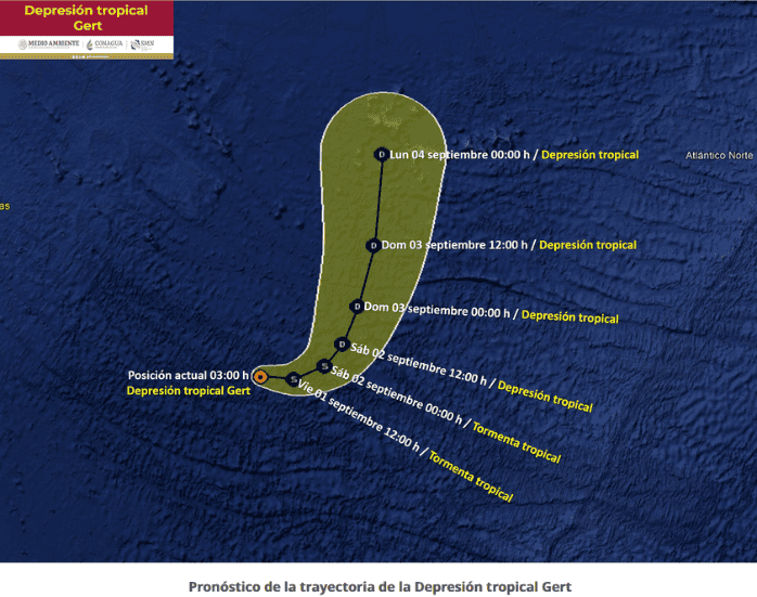 "Gert" se reactivó como depresión tropical en el Océano Atlántico Central, luego de varios días de haber desaparecido, y se encuentra en el este-sureste de Bermuda, aunque por su distancia no afecta a las costas mexicanas; informó el Servicio Meteorológico Nacional (SMN), fuente oficial del Gobierno de México en materia climática.Lo último que se informó de "Gert" fue el pasado 22 de agosto, cuando el SMN informó que era una depresión tropical y se encontraba a 370 km al este-sureste de las Antillas Menores y a 2 mil 875 km al este de las costas de Quintana Roo.Pero este viernes 1 de septiembre, "Gert" se reactivó como depresión tropical a mil 020 km al este-sureste de Bermuda y a 3 mil 305 km al este-noreste de las costas de Quintana Roo. Según el SMN, este día el punto más cercano de "Gert" es a mil 020 km al este-sureste de Bermuda y a 3 mil 305 km al este-noreste de las costas de Quintana Roo. Se espera que este mimos día, el sistema alcance la categoría de tormenta tropical y continúe así, hasta mañana.Con información del Servicio Meteorológico NacionalOA