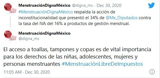 Este lunes, un grupo de 169 legisladores de distintas fuerzas políticas, acompañados de distintos colectivos de la sociedad civil, presentaron una acción de inconstitucionalidad ante la Suprema Corte de Justicia de la Nación para que se elimine el Impuesto al Valor Agregado (IVA) a todos los productos de higiene menstrual.La diputada federal de Movimiento Ciudadano, Martha Tagle, informó de esta impugnación que se presentó y dijo que ahora le tocará a la Suprema Corte decidir sobre la "justicia menstrual y la equidad tributaria" para que se logre una política tributaria con enfoque de género.En un documento anexo, la organización "#MenstruaciónDignaMéxico" dio a conocer que respalda la acción de inconstitucionalidad que presentó el 34% de los diputados contra la tasa del IVA del 16% a productos de gestión menstrual.A través de su Twitter, dicha organización dijo que el acceso a toallas, tampones y copas es de vital importancia para los derechos de las niñas, adolescentes, mujeres y personas menstruantes."Gracias a esta acción, le tocará a la @scjn decidir sobre la justicia menstrual y la equidad tributaria para lograr una política tributaria con enfoque de género #MenstruaciónLibreDeImpuestos", posteó la organización.En la aprobación de la Ley de Ingresos, diversas bancadas, incluidas de Morena, presentaron una propuesta de modificación para que se no se gravaran estos productos; sin embargo, la mayoría legislativa lo impidió, por lo que en el 2021 se seguirán cobrando impuestos a toallas, tampones y copas sanitarias.En el documento presentado en la Gaceta Parlamentaria y expuesto por la diputada de MC, Martha Tagle, se describe como una propuesta que forma parte de una estrategia más amplia impulsada por el colectivo "#MenstruaciónDignaMéxico" para que la gestión menstrual se vea como un tema público que debe ser incorporado a las políticas públicas para crear condiciones estructurales que permitan a todas las mujeres, niñas, adolescentes y otras personas menstruantes en México, vivirla con dignidad.Y se divide en tres ejes de acción: 1) la gratuidad de los productos de gestión menstrual, 2) la eliminación del IVA a dichos productos, y 3) generar investigación y datos sobre la gestión menstrual en México.JM