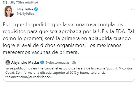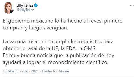 Luego de que la revista médica británica "The Lancet" publicara que la vacuna rusa Sputnik V contra el COVID-19 tiene una eficacia de 91.6%, la senadora Lilly Téllez señaló que el Gobierno de México "ha hecho al revés", al adquirir primero las dosis y luego averiguar su funcionalidad. "La vacuna rusa debe cumplir los requisitos para obtener el aval de la UE, la FDA, la OMS. Es muy buena noticia que la publicación de hoy ayudará a lograr el reconocimiento científico", indicó Téllez.La legisladora de Acción Nacional mencionó que ella ha pedido que esta dosis cumpla con los requisitos para que sea aprobada por la Unión Europea y la Administración de Medicamentos y Alimentos (FDA, por sus siglas en inglés)."Tal como lo prometí, seré la primera en aplaudirla cuando logre el aval de dichos organismos. Los mexicanos merecemos vacunas de primera", escribió este martes en redes sociales la legisladora de Acción Nacional.Asimismo, la legisladora por Sonora respondió a Antonio Attolini, militante Morena, quien señaló que la senadora Téllez "está completamente desacreditada para poder hablar de los que sea respecto a la pandemia después del papelón tan vergonzoso que hizo la semana pasada"."Mi exigencia para México es vacunas de primera y que la rusa empiece a cumplir los requisitos para que sea aprobada por la UE y la FDA, es muy buena noticia."Yo pienso en salud y usted en política: usted se queja de que los muertos afean su campaña", respondió Lilly Téllez."Lo que importa a Morena es la política y el poder a como dé lugar", indicó en otro mensaje de Twitter.En la conferencia mañanera de este martes en Palacio Nacional, Hugo López-Gatell, subsecretario de Prevención y Promoción de la Salud, destacó el 91.6% de eficacia de la Sputnik V.La vacuna rusa Sputnik V es segura, tiene 92% de eficacia y se puede usar de manera segura en adultos mayores, señaló López-Gatell.A lo largo de días pasados, Lilly Téllez ha criticado la vacuna rusa, porque no había sido aprobada por la comunidad científica, además que sería avalada por la Comisión Federal para la Protección contra Riesgos Sanitarios (Cofepris)."La OMS apenas la está analizando, Rusia ha sido cuestionada por la comunidad científica por presentar información falsa. No tiene autorización de venta de emergencia", escribió la senadora por Sonora."México no requiere 'afecto' de Rusia; un país antidemocrático, autoritario, sin libertad de expresión y corrupto. Menos necesitamos sus vacunas de mala calidad, no subestimen al pueblo", agregó en otro mensaje.NR