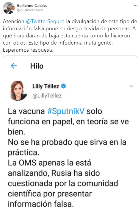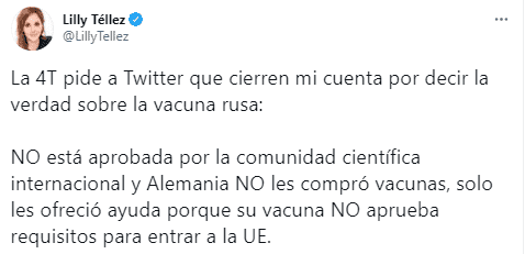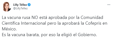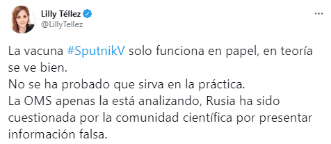 Después de que el Presidente Andrés Manuel López Obrador (AMLO) acordara con su homólogo ruso, Vladimir Putin, la compra de 24 millones de dosis de la vacuna Sputnik V, la senadora por el PAN Lilly Téllez señaló que el biológico ruso "solo funciona en papel", ya que no se ha comprobado su efectividad. Ante lo cual afirmó que la razón del Gobierno de México para adquirirla es por su precio asequible. A través de su cuenta de Twitter, la legisladora de Acción Nacional refirió que la vacuna Sputnik V “en teoría se ve bien”, pero no se ha probado que sirva en la práctica. Además de que la OMS apenas la está analizando. "Rusia ha sido cuestionada por la comunidad científica por presentar información falsa. No tiene autorización de venta de emergencia", escribió la senadora por Sonora."La vacuna no está aprobada por la Comunidad Científica Internacional pero la aprobará la Cofepris en México. Es la vacuna barata, por eso la eligió el Gobierno", criticó en otro mensaje.La legisladora arremetió no solo contra la vacuna sino contra el gobierno Ruso en general, al cual calificó como antidemocrático, autoritario, sin libertad de expresión y corrupto. "Menos necesitamos sus vacunas de mala calidad, no subestimen al pueblo", agregó.Asimismo, Lilly Téllez mencionó que únicamente México, Bielorrusia, Venezuela, Argentina, Bolivia, Argelia, Serbia y Palestina apuestan por la vacuna rusa.También criticó que los senadores de Morena han negado el exhorto a Cofepris."Si el Presidente necesita remdesivir para su tratamiento ¿lo comprarán en el mercado negro?", cuestionó luego de que el Presidente Andrés Manuel López Obrador diera positivo a COVID -19, el pasado domingo 24 de enero."¿Porqué por la vacuna rusa cuando no han terminado de hacerse las pruebas ni validaciones sobre la misma y los resultados no son los óptimos? No se tiene claridad sobre su eficacia y seguridad, aún no se tienen los estudios de la fase 3 y de la fase 2 se entregaron cifras alteradas", cuestionó.Después de las declaraciones de la senadora, simpatizantes del Gobierno fereral pidieron que su cuenta fuera dada de baja por difundir información falsa. Por lo que Telléz respondió asegurando que la información es veridica: "La 4T pide a Twitter que cierren mi cuenta por decir la verdad sobre la vacuna rusa: NO está aprobada por la comunidad científica internacional y Alemania NO les compró vacunas, solo les ofreció ayuda porque su vacuna NO aprueba requisitos para entrar a la UE".Juan Ferrer, titular del Instituto de Salud para el Bienestar (Insabi), dijo en conferencia mañanera de este martes que se prevé que la próxima semana lleguen a México 200 mil dosis de la vacuna rusa Sputnik V.De acuerdo con la Organización Mundial de la Salud (OMS), la Sputnik V se encuentra en fase 3 y en nuestro país, la Cofepris sólo ha autorizado las vacunas de Pfizer y AstraZeneca para su uso de emergencia.De acuerdo con Hugo López-Gatell, subsecretario de prevención y Promoción de la Salud, la vacuna Sputnik V no se podrá aplicar en México hasta que no cuente con la autorización para uso de emergencia de la Cofepris.Hungría se ha sumando a Bielorrusia, India y Emiratos Árabes Unidos en la lista de países que prueban esta vacuna, cuya eficacia, según Moscú, llega al 95%. NR