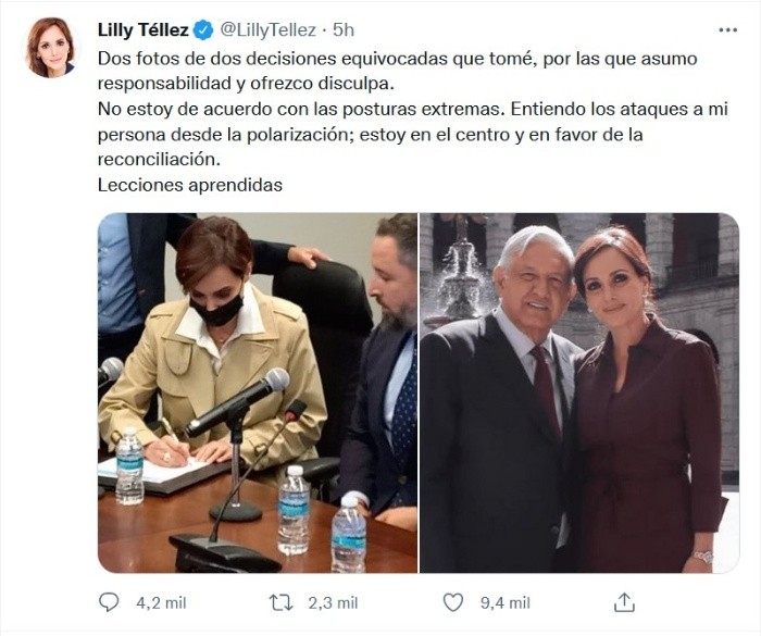 En sus redes sociales, la senadora del Partido Acción Nacional (PAN), Lilly Téllez, reconoció este lunes que tomó "dos decisiones importantes", de las que dijo hoy sentirse arrepentida.A través de Twitter, la legisladora panista acompañó su mensaje con dos fotografías en las que aparece junto a dos líderes políticos. En la primera imagen, Téllez se encuentra sentada al lado del presidente de VOX, Santiago Abascal, y pide una disculpa al decir que no está de acuerdo con "las posturas extremas"."Dos fotos de dos decisiones equivocadas que tomé, por las que asumo responsabilidad y ofrezco disculpa", expresó en Twitter.El pasado viernes, Lilly Tellez rechazó tener alguna alianza con el partido ultraderechista de España, al asegurar que firmó la "Carta de Madrid" porque es un contrapeso al Foro de Sao Paulo. "Detesto los extremismos, la homofobia, el antisemitismo, el racismo y el nacionalismo. Defiendo la libertad y la democracia", expresó en aquella ocasión.Además, como una forma de marcar distancia, aclaró que defiende la libertad y la democracia.En la segunda fotografía, la legisladora se encuentra junto al Presidente Andrés Manuel López Obrador (AMLO), y también dio a entender que fue un error haber apoyado a Morena y al Mandatario. Por ello, dijo haber aprendido la lección y estar a favor de "el centro y en favor de la reconciliación".Si te interesó esta noticia y quieres saber más, entonces descarga y descubre INFORMAPlus, la aplicación digital de EL INFORMADOR, en donde tenemos contenidos exclusivos, seleccionados por nuestros editores, para darles una experiencia más completa a los lectores. Si eres suscriptor de EL INFORMADOR tu acceso está incluido, solicítalo al 33 3678-7777.Descarga la aplicación y pruébala GRATIS por treinta días.Para iOS: https://apple.co/35jaVgbPara Android: https://bit.ly/3gwVSEVJM