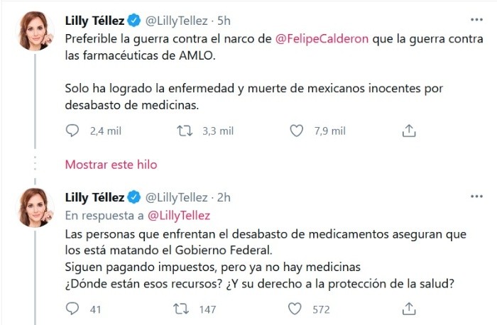 La tarde de este martes la senadora por Sonora, Lilly Téllez, hizo una comparación entre la estrategia contra el narcotráfico del expresidente Felipe Calderón y las medidas tomadas por el Presidente Andrés Manuel López Obrador (AMLO) contra las farmacéuticas.A través de Twitter, Téllez expresó que es "preferible la guerra contra el narco de @FelipeCalderon que la guerra contra las farmacéuticas de AMLO". Luego de que su comentario causara gran polémica entre los usuarios, horas después la legisladora justificó lo antes escrito.La senadora señaló que Calderón intentó cumplir con su mandato al preservar la seguridad del país, mientras que AMLO, expuso, incumple con su obligación de proteger la salud.En otro de sus mensajes, Téllez señala que quienes enfrentan el desabasto de medicamentos "aseguran que los está matando el Gobierno federal" y pese a que pagan impuestos no hay medicinas, por lo que cuestionó el destino de dichos recursos. Asimismo, compartió una lista de los padecimientos afectados por la falta de fármacos.Entre las reacciones a sus comentarios, destaca la respuesta de Antonio Attolini, candidato de Morena a diputado federal por Torreón, quien dijo a la legisladora merece el desprecio que la gente siente por ella.Momentos antes de que la senadora hiciera tales comparaciones, acusó a los senadores de Morena por no aprobar su exhorto para que se informe, investigue y sancione a los responsables de la falta de medicamentos.JM