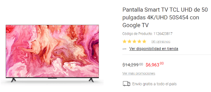 Durante el pasado mes de diciembre millones de personas pudieron aprovechar de grandes descuentos en diferentes artículos y productos que las diferentes tiendas lanzaron, como por ejemplo ropa, tenis, electrodomésticos, videojuegos, celulares, entre otras cosas más. A pesar de que ya pasaron las fiestas decembrinas, la tienda departamental Liverpool sigue con los grandes rebajas y durante su Gran Barata de Invierno han bajado sus precios en diferentes artículos, entre esos las pantallas de televisión, las cuales varias de ellas tienen descuentos de hasta el 20% de descuento. Liverpool ha decidido poner en remate una Pantalla Smart de marca TCL de 50 pulgadas 4K, que de tener un precio de $14,299 queda en un total de $6963. De acuerdo a la descripción del producto podrás disfrutar al máximo películas y series con su imagen impresionante con el poder del 4K UHD, tal y como si estuvieras en el cine y experimenta hasta el mínimo detalle. Además cuenta con Inteligencia Artificial integrada, puedes controlar con tu voz tu Google TV y conectar con el resto de tus dispositivos inteligentes a través del control remoto con voz y Google Assistant Integrado.Este promoción aplica únicamente haciendo la compra en línea a través del sitio web www.liverpool.com.mx.MF