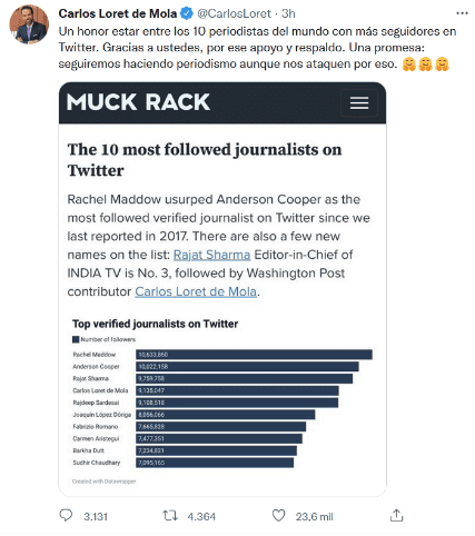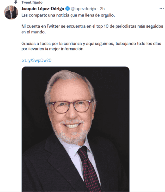 Carlos Loret de Mola, Joaquín López-Dóriga y Carmen Aristegui, son los únicos periodistas mexicanos que están en el top 10 mundial con más seguidores en la red social de Twitter, según reveló la red para comunicadores, Muck Rack. En la lista que se publicó se observa que Carlos Loret de Mola, quien ha estado en el ojo del huracán debido a los múltiples desencuentros con el Presidente Andrés Manuel López Obrador, está en el cuarto lugar, mientras que López-Dóriga y Aristegui se encuentran en el sexto y octavo lugar, respectivamente.El presentador de LatinUs cuenta con más de nueve millones de seguidores, le sigue López-Dóriga con poco más de ocho millones, y después está Aristegui con más de siete millones. Los tres tienen cuentas verificadas, es decir, con la famosa palomita azul.Luego de la publicación de la lista, Loret de Mola agradeció a sus seguidores por el apoyo, y prometió seguir haciendo periodismo "aunque nos ataquen por eso".Por su parte, López-Dóriga compartió la noticia: “Mi cuenta en Twitter se encuentra en el top 10 de periodistas más seguidos en el mundo. Gracias a todos por la confianza y aquí seguimos, trabajando todos los días por llevarles la mejor información”.Carmen Aristegui es la única que no se ha pronunciado al respecto.Los tres periodistas mexicanos comparten el top 10 con Rachel Maddow, de MSNBC; Anderson Cooper, de CNN; Rajat Sharma, de INDIA TV; Rajdeep Sardesai, de India Today; Fabrizio Romano, de The Guardian; Barkha Dutt, de The Washington Post; y Sudhir Chaudhary, de Zee News. Según Muck Rack, el 77 % de los periodistas valoran Twitter más que cualquier otra red social.GC
