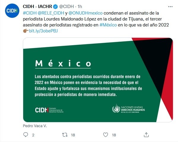 La Comisión Interamericana de Derechos Humanos (CIDH) condenó este viernes el asesinato de la periodista Lourdes Maldonado, el tercer caso de muerte violenta de reporteros en México en lo que va de 2022, e instó al Estado mexicano a tomar medidas.Lourdes Maldonado, quien cubría temas policiales, de corrupción y de política local en Baja California, tenía custodia policial desde hace un año para cuando llegaba y salía de su casa, pero el pasado domingo le dispararon justo cuando estaba en su automóvil, frente a su domicilio, en Tijuana.En un comunicado la CIDH, junto con su Relatoría Especial para la Libertad de Expresión (RELE) y la Oficina en México del Alto Comisionado de las Naciones Unidas para los Derechos Humanos (ONU-DH) instan al Estado "a investigar de forma pronta, seria e imparcial los hechos".La investigación -añaden- debe "esclarecer no sólo la autoría material de los hechos sino también los autores intelectuales de estos ataques".En una rueda de prensa en marzo de 2019, Lourdes Maldonado pidió al Presidente Andrés Manuel López Obrador (AMLO) "apoyo, ayuda y justicia laboral" en relación con un litigio laboral con la empresa Primer Sistema de Noticias (PSN), propiedad de Jaime Bonilla, exgobernador de Baja California, medio en el cual Lourdes Maldonado había trabajado.Cuatro días antes de su asesinato, ella hizo pública la decisión a su favor de la Junta Federal de Conciliación y Arbitraje (JFCA).Los atentados contra reporteros en México "ponen en evidencia la necesidad de que el Estado ajuste y fortalezca sus mecanismos institucionales de protección a periodistas de manera inmediata", añade el comunicado.JM