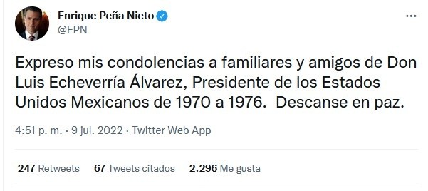 El expresidente Enrique Peña Nieto expresó sus condolencias a familiares y amigos de Luis Echeverría Álvarez, quien falleció ayer por la noche y a quien deseó que descanse en Paz.En su cuenta de Twitter, el exmandatario escribió: "Expreso mis condolencias a familiares y amigos de Don Luis Echeverría Álvarez, Presidente de los Estados Unidos Mexicanos de 1970 a 1976. Descanse en paz", escribió en la red social. Con esta suman dos ocasiones en menos de tres días que el expresidente Peña Nieto reaparece en redes sociales.El pasado jueves, luego de que Pablo Gómez, titular de la Unidad de Inteligencia Financiera (UIF), informara que se presentó ante la FGR una denuncia contra el exmandatario por posibles operaciones con recursos de procedencia ilícita por más de 26 millones de pesos.En esta misma red social Peña Nieto aseguró que su patrimonio está constituido legalmente, por lo que expresó su certeza en que se aclarará cualquier sospecha sobre el mismo. "En relación con la denuncia presentada en mi contra por la Unidad de Inteligencia Financiera, estoy cierto que ante las autoridades competentes se me permitirá aclarar cualquier cuestionamiento sobre mi patrimonio y demostrar la legalidad del mismo, dentro de los procedimientos legales. Expreso mi confianza en las Instituciones de procuración y administración de Justicia", escribió.JM