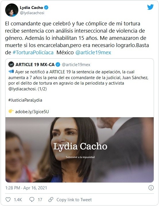Autoridades ampliaron la condena de cinco a siete años de cárcel al excomandante de la Policía Judicial, Juan Sánchez Moreno, quien ejecutó la detención ilegal y tortura de la periodista Lydia Cacho en 2005, informó este viernes la también escritora y defensora de derechos humanos."El comandante que celebró y fue cómplice de mi tortura recibe sentencia con análisis interseccional de violencia de género. Además lo inhabilitan 15 años", apuntó Lydia Cacho en un mensaje en Twitter."Me amenazaron de muerte si los encarcelaban, pero era necesario lograrlo. Basta de #TorturaPolicíaca", añadió.La activista fue detenida en diciembre de 2005 por una decena de policías que, sin contar con orden de captura, la trasladaron de Cancún a Puebla en un vehículo propiedad del empresario José Kamel Nacif.El empresario era uno de los principales señalados en el libro dedicado a la investigación del suceso titulado "Los demonios del Edén", en el que la periodista denunció una trama de pornografía y prostitución infantil.Durante el viaje por carretera de Cancún a Puebla, que duró más de 20 horas, Cacho fue torturada física y psicológicamente y dijo que sufrió tocamientos e insinuaciones sexuales y amenazas de muerte.Este viernes, la periodista dijo que la magistrada María Elena Suárez Préstamo, quien dictó la resolución, "es la jueza que no se arredra, que no se ha rendido ni vendido a pesar de las presiones del poder".Horas antes, la organización Artículo 19 informó que el jueves se les notificó la sentencia de apelación "la cual aumenta a siete años la pena del excomandante de la judicial, Juan Sánchez Moreno, por el delito de tortura en agravio de la periodista y activista".La organización dijo que "con el segundo sentenciado en el caso, se da un paso importante hacia la justicia"; sin embargo, sigue pendiente el proceso judicial contra tres implicados y la captura de otros que se encuentran prófugos.JM