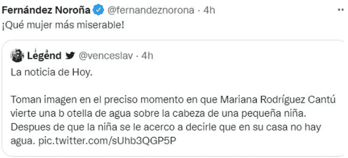 La primera dama de Nuevo León, Mariana Rodríguez Cantú, de nuevo está en medio de la polémica por su interacción con una niña, a quien derramó agua. Sin embargo, la esposa del gobernador Samuel García reaccionó a la polémica y pidió “ver el video completo”, para no suponer cosas donde "no hay".“Si algo le he dado a esta niña es paciencia y amor, mucho amor”.La fotografía, que se hizo viral la tarde de este martes 14 de junio gracias al usuario @venceslav, muestra a Mariana “jugando” con una niña y un texto donde se afirma que la influencer derramó el líquido sobre la cabeza de la niña luego de que ésta se acercara a decirle que en su casa no había agua. Rápidamente la publicación fue vista por miles y compartida en varias redes sociales, como Twitter, donde incluso el diputado Gerardo Rodolfo Fernandez Noroña reaccionó de una manera negativa, llamando “miserable” a Cantú. Momentos después, borró la publicación.Ante las críticas en redes sociales, Mariana tomó la decisión de explicar el origen de la fotografía y publicó en sus redes sociales algunas capturas, junto a un video, donde se ve que estaba “jugando con Ximena”. “Dejen de hacer pe** donde no hay”, escribió Mariana. “Si algo le he dado a esta niña es paciencia y amor, mucho amor”.En otra publicación, Mariana Rodríguez escribió: “Dios, dame paciencia para lidiar con tanta gente loca”.Pese a que Mariana explicó el origen de esta polémica, las críticas continuaron, algunas donde se exigía a las autoridades del DIF de Nuevo León investigar sobre el hecho.Recientemente, Forbes publicó la lista de “Las 100 Mujeres Más Poderosas de México”, donde Mariana hizo su aparición como una de las más destacadas. También aparecieron Paola Shietekat, Danna Paola, Paola Hanneman, Azucena Uresti y Alejandra del Moral, entre otras.No es la primera vez que critican a Mariana Rodríguez en redes sociales pues, además de los comentarios negativos hacia la revista por incluir a la influencer, también se le ha criticado por diversas situaciones relacionadas con niños, presumir sus vestimentas, el “falso” feminismo y, por supuesto, el desabasto de agua que vive actualmente Nuevo León.AC