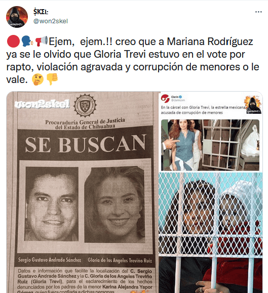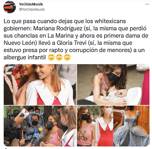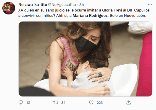 La esposa de Samuel García, Mariana Rodríguez, está nuevamente en la polémica, pues usuarios la están criticando por haber invitado a la cantante regiomontana, Gloria Trevi a visitar el Centro DIF Capullos. La también influencer presumió en sus redes sociales la visita de Gloria Trevi e incluso le agradeció por el donativo que hizo para el Centro. Mariana aprovechó para tomar múltiples fotos a Gloria Trevi cuando estaba conviviendo con los niños, y compartió desde el momento en que la recibieron en sus historias de Instagram.Durante el encuentro, Trevi se tomó un momento para interpretar sus mayores éxitos como “Zapatos viejos” y otros más. Y pese a que esta visita solo buscaba brindar un buen momento a los pequeños, algunos usuarios en redes sociales criticaron a Mariana Rodríguez por llevar a Trevi al lugar, ya que cabe recordar, la cantante estuvo involucrada en un gran escándalo donde se le acusó de trata de blancas y otros delitos. La primera dama de Nuevo León, Mariana Rodríguez, no deja de dar de qué hablar, y es que ayer en sus redes sociales compartió que llegó al Palacio de Gobierno vestida como "cenicienta", una de las princesas de Disney, hecho que no cayó nada bien entre los internautas. GC