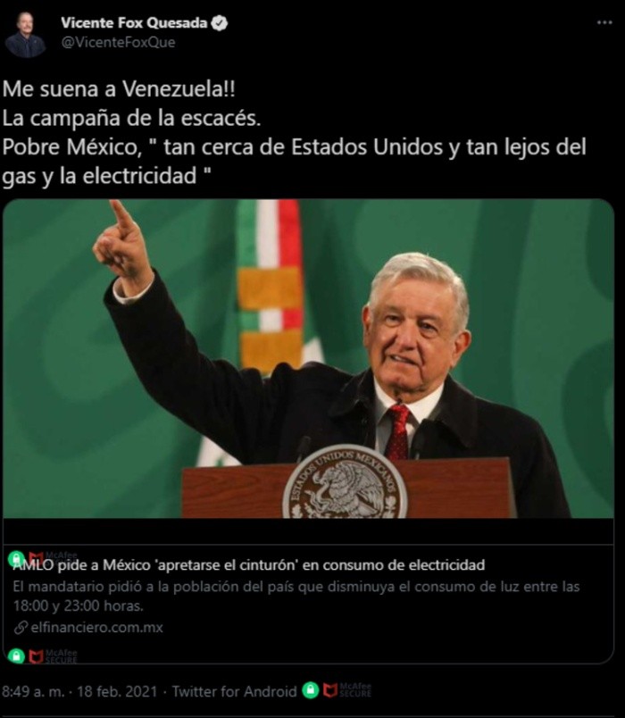 Luego de que AMLO pidiera ahorrar el consumo de energía de 18:00 a 23:00 horas, Vicente Fox criticó la medida y la comparó con Venezuela