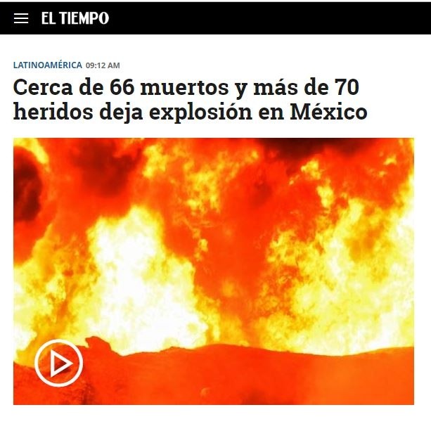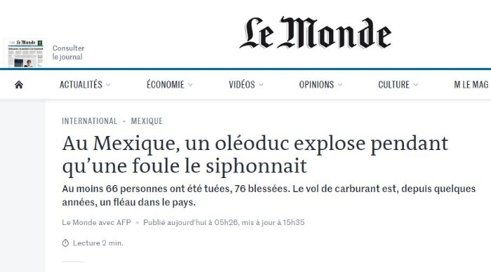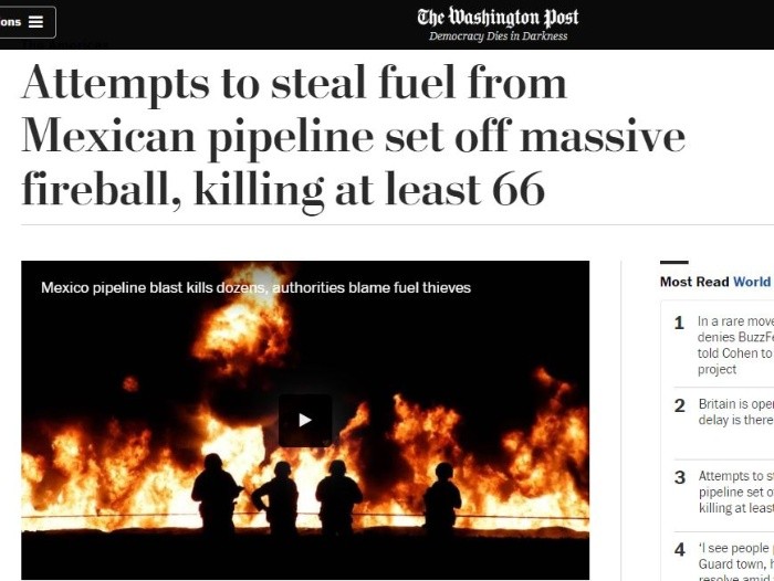 Luego de semanas de la estrategia de lucha en contra del Huachicoleo implementada por el Presidente Andrés Manuel López Obrador, la explosión en el ducto de Tlahuelilpan, Hidalgo, llamó la atención no solo de México, sino de los medios internacionales.A través de sus ediciones impresas y de sus portales web medios de comunicación en distintas partes del mundo han hecho eco de esta tragedia.El diario The New York Times, en Estados Unidos, publicó una pieza titulada "Explosión en México mata a 66 después de que ladrones perforaran un gasoducto", acompañado de videos y fotografías, y destacan lo que dijo esta mañana el Presidente López Obrador de que continuará con la lucha en contra del robo de combustibles: "El presidente de México juró este sábado que redoblará su lucha contra la epidemia de robo de gasolina, luego de que una fuga causara una explosión que mató a 66 personas y dejó a 76 heridos..."El diario The Washington Post también destaca en su encabezado el número de víctimas que dejó este hecho y agregan que, el robo de combustible, deja pérdidas cercanas a los tres mil millones de dólares al año: "A inicios de este mes, Andrés Manuel López Obrador cerró la mayoría de los ductos de gasolina dejando a docenas de ciudades con un desabasto de combustible".En Reino Unido, The Guardian publicó: "Se registran víctimas mortales luego del incendio en un gasoducto". En la pieza hacen mención de que "el origen de la explosión sigue sin confirmarse, pero trajo consigo los horrores del robo de combustible hecho mediante los dictos de la compañía petrolera Pemex".Uno de los rotativos más importantes en Francia, "Le Monde", también replicó la noticia: "Varios muertos y heridos en explosión de oleoducto en México".Además de resaltar el robo de combustibles, hablaron de la atención por parte de los cuerpos de bomberos y ambulancias que llegaron al lugar: "Las unidades de bomberos y ambulancias de la petrolera estatal Pemex, que tiene una refinería al lado, llegaron al lugar para atender a las víctimas".En América Latina, el periódico El Tiempo, de Colombia también se enfocó en el número de muertos que se han confirmado hasta el momento titulando "Cerca de 66 muertos y más de 70 heridos deja explosión en México" y narran el momento del accidente: "Al estallar, el combustible creó una especie de barrera de fuego donde se encontraba la mayor cantidad de personas. Es en este punto donde las autoridades creen que puede haber más personas fallecidas ya que era el sitio donde había más combustible."OF