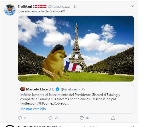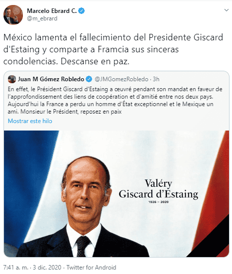 El titular de Secretaría de Relaciones Exteriores, Marcelo Ebrard, envió un mensaje de condolencias a través de su cuenta de Twitter por el fallecimiento del ex presidente francés Valéry Giscard d'Estaing, sin embargo cometió un pequeño error que no pasó desapercibido en redes sociales.El desliz fue que escribió “Framcia” en lugar de Francia, ante lo cual surgieron memes que han posicionado a “Framcia” como tendencia.“México lamenta el fallecimiento del Presidente Giscard d'Estaing y comparte a Framcia sus sinceras condolencias. Descanse en paz”, fueron las palabras del canciller mexicano.Usuarios han respondido al tuit del secretario con divertidas imagenes que se burlan del error. Algunos de ellos han salido a la defensa del funcionario, sin dejar de aportar a la galería de memes del suceso. El vigésimo presidente de Francia, Valéry Giscard d'Estaing murió el día de ayer a los 94 años a causa del coronavirus.El ex presidente francés estuvo hospitalizado varias veces en los últimos meses. Finalmente falleció en su casa familiar en Authon, en el centro de Francia.Giscard fue en su momento el jefe del Estado francés más joven y, tras dejar el cargo, una de las voces más escuchadas de la vida política francesa.NR