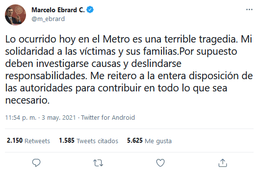A través de su cuenta de Twitter, el secretario de Relaciones Exteriores, Marcelo Ebrard envió un mensaje hablando sobre el accidente del Metro de la Ciudad de México que, hasta el momento, ha dejado un saldo de 13 muertos y 70 personas heridas.En sus redes sociales, Ebrard aseguró que "lo ocurrido hoy en el Metro es una terrible tragedia. Mi solidaridad a las víctimas y sus familias.Por supuesto deben investigarse causas y deslindarse responsabilidades. Me reitero a la entera disposición de las autoridades para contribuir en todo lo que sea necesario."Cabe resaltar que esta obra fue hecha durante la administración de Ebrard como Jefe de Gobierno de la capital del país.Le secretaria de Protección Civil, Myriam Urzúa, confirmó que hay 70 lesionados y 13 fallecidos.GC