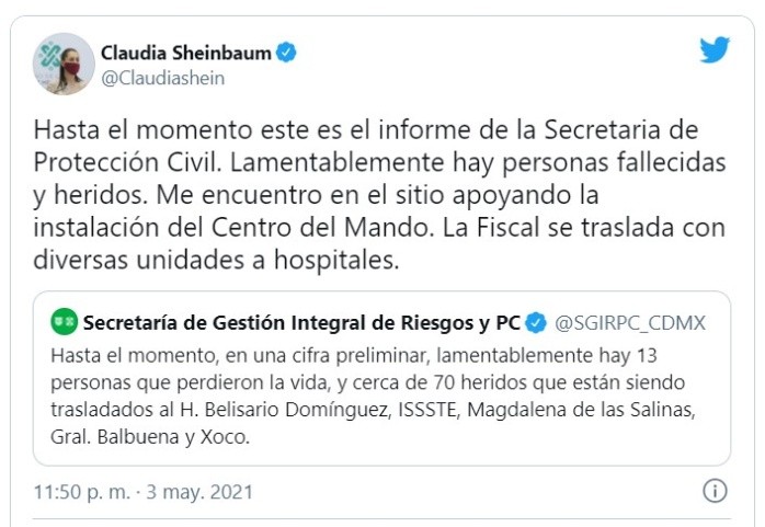 La jefa de Gobierno de la Ciudad de México, Claudia Sheinbaum, confirmó el fallecimiento de 15 personas además de 70 lesionados hasta el momento en el accidente ocurrido en el viaducto de la estación Olivos del Metro de la Ciudad de México.Para las 02:00 horas de este martes, la jefa de Gobierno actualizó la cifra de muertos a 20, entre ellos algunos menores de edad.Los hechos se suscitaron alrededor de las 10:25 pm, con el desplome de una unidad del Sistema de Transporte Colectivo (STC) Metro.Según versiones, la estación Olivos colapsó luego de que un vehículo chocara contra una de las columnas que lo sostienen, provocando que la ballena se viniera abajo, justo en el momento en que pasaba un convoy, refiere el informe preliminar de las autoridades de seguridad.El gobierno capitalino indicó que están laborando 22 ambulancias del ERUM, ocho del CRUM, 10 de Cruz Roja, y personal de Bomberos en el lugar del accidente en la estación de la línea 12, ubicado en avenida Tláhuac.La jefa de Gobierno de la CDMX, Claudia Sheimbaum, se encuentra en el lugar, colaborando con las autoridades y en momentos ofrecerá una rueda de prensa. JL