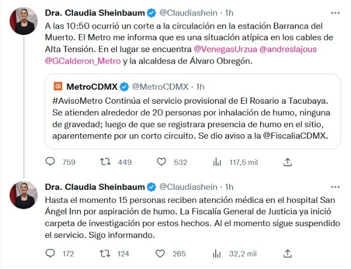 La jefa de Gobierno de la Ciudad de México, Claudia Sheinbaum, informó que hasta el momento 15 personas reciben atención médica en el hospital San Ángel Inn por aspiración de humo."A las 10:50 ocurrió un corte de la circulación en la estación Barranca del Muerto. El Metro me informa que es una situación atípica en los cables de alta tensión. En el sitio está la secretaria @VenegasUrzua, @andreslajous, personal del Metro y la alcaldesa de Álvaro Obregón".La Fiscalía General de Justicia de la Ciudad de México refirió que inició una carpeta de investigación tras el cortocircuito que se registró esta mañana en la estación Barranca del Muerto en la Línea 7 del Metro donde se reportan al menos 20 intoxicados por el humo que se generó.A través de sus redes sociales, las autoridades indicaron que darán más tarde información.Personal del área jurídica del Metro dio aviso a la Fiscalía General de Justicia para que realice las investigaciones correspondientes.JM