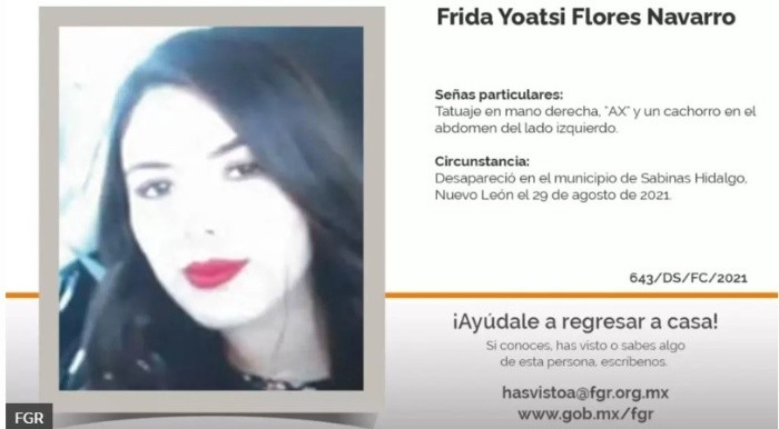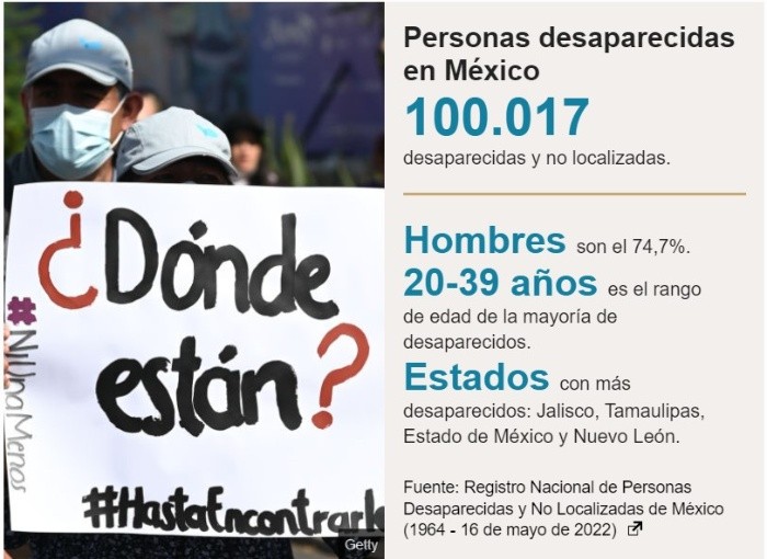 100.000 desaparecidos. 100.000 familias destrozadas.Desde el pasado 16 de mayo, México supera esta cifra en su registro oficial de personas desaparecidas en el país, lo cual da una idea de la auténtica "crisis humanitaria" que supone esta tragedia, tal y como la calificó el gobierno el año pasado.Aunque el conteo oficial inició en 1964, las desapariciones aumentaron vertiginosamente desde que en 2006 se inició la llamada "guerra contra el narco" del entonces presidente Felipe Calderón.Durante su última visita a México, el Comité contra las Desapariciones Forzadas de Naciones Unidas denunció que el crimen organizado es el perpetrador central de estos hechos, aunque también señaló como responsables a funcionarios públicos.Por ello, instó a tomar acciones para acabar con la impunidad que campa a sus anchas -casi un 95% de los delitos en México quedan sin resolver- y a instaurar una política nacional que sirva para prevenir y erradicar las desapariciones."Se está haciendo un trabajo como nunca de búsqueda, ningún gobierno se había ocupado de los desaparecidos como ahora (...) y a buscar fosas clandestinas porque no se debe de olvidar que hubo una guerra contra el narcotráfico" durante la que "murieron muchos y los desaparecieron", declaró el presidente mexicano, Andrés Manuel López Obrador, tras conocerse el reciente y triste récord de desaparecidos en el país.En los últimos meses, el estado norteño de Nuevo León ha estado bajo el foco por el aumento de desaparición de mujeres -especialmente jóvenes, con algunos casos tan mediáticos como el de Debanhi Escobar- y por las irregularidades cometidas y reconocidas por la Fiscalía estatal durante la investigación.Pero miles de otras desapariciones no atraen la misma atención y son los familiares de las víctimas quienes luchan a diario para impedir que, con el paso del tiempo, sus casos caigan en el olvido de las autoridades y de la sociedad.Porque la cifra de 100.000 desaparecidos recién alcanzada es mucho más que un número: esconde historias de búsquedas en terreno con las propias manos de las familias que, en ocasiones, acaban prácticamente destrozadas de por vida a causa de la tragedia.El de la joven Frida Flores, desaparecida el año pasado también en Nuevo León, es uno de ellos. Su madre, Erika Navarro, compartió entre llantos su historia con BBC Mundo y aseguró que ni todo el dolor del mundo le hará desistir de buscar hasta encontrar a su hija.Mi hija Frida Yoatsi desapareció el 29 de agosto de 2021 en el municipio de Sabinas Hidalgo, Nuevo León. El 7 de septiembre ella cumplía 19 años.Me dijo que iba a comer con unos amigos y me dijo que estuviera tranquila, que no se iba a tardar.La última vez que hablé con ella por teléfono fue a las 5:00 de la tarde, cuando me dijo que ya en un rato volvía. Pero pasaron las horas y no llegaba, así que empecé a preocuparme mucho.Volví a llamarla y ya no respondía. Pasadas las 9:00 de la noche, su teléfono estaba ya apagado.Me la pasé toda la noche sentada, esperando y esperando, hasta que en la mañana siguiente fui a poner la denuncia. ¿Dónde estaba mi hija? ¿Quién se la llevó?Lo que pasó fue que al salir de un restaurante con una amiga, las abordó una camioneta. Las subieron a las dos. La amiga dice que no vio a la persona que las subió, solamente que era una mujer.A la amiga la bajaron cerca de su casa, pero a mi hija se la llevaron. Ahí se pierde el contacto y ya no se sabe nada. Desde entonces, no se sabe nada. Es como que a Frida se la hubiera tragado la tierra.Como Sabinas es un foco rojo donde hay muchas desapariciones, en aquellas primeras horas sí pensé que quizá no la iba a volver a ver, o que la iba a ver… no sé cómo.La Fiscalía me dice que están en la búsqueda y trabajando en ello. Y de alguna manera les comprendo, porque son miles de casos, pero en lo personal me duele mucho que hasta ahorita no tengo respuesta de nadie. Dicen que han hecho su trabajo, pero no me han resuelto nada.15 días antes de su desaparición, en la zona se habían llevado a otras muchachas. A Frida le dije muchas veces que no fuera a Sabinas, que estaba peligroso… Pero ella tenía amistades allá, porque aunque ahora vivimos en Apodaca, se criaron en Villaldama, un pueblo junto a Sabinas.Siempre le he intentado dar buenos consejos a Frida porque soy muy nerviosa hacia la inseguridad aquí en Nuevo León, donde uno ve diario que ya hace años que se roban muchachitas, que las violan, las matan, las secuestran… y jamás veo que encuentren al responsable. Hay muchísima impunidad.Estos casi nueve meses son meses de angustia, de sufrimiento. Pero yo voy a seguir alzando la voz y buscando a mi hija hasta encontrarla.Me duele tanto y estoy pasando una situación tan difícil, que a nadie se la deseo. Aún así, yo no busco culpables, solo quiero el regreso de Frida y que se acabe esta pesadilla.He sufrido mucho este tiempo. Me he enfermado, me atacan los nervios, me entra mucho pánico y no duermo por la noche. El psicólogo me tiene medicada, pero no descanso al 100%.He perdido mi trabajo como enfermera. Voy nada más si me sale una guardia específica. Al no dormir, no aguanto mi cabeza y me duele todo el cuerpo. No puedo buscar un trabajo estable porque no me concentro.Eso también me repercute para sobrevivir, claro. Mi hija mayor me ayuda mucho, mis hermanas y mi prima… Yo voy vendiendo cosas que no necesito, porque ¿para qué quiero nada ahora?Desde que enviudé hace un año, me quedé al frente de mis tres hijas. Yo voy a cumplir 42 años. Mi hija mayor de 21 ha estado al pie del cañón, ha sufrido y sufre a la par conmigo.Tengo otra niña de 16 años, que está con su abuelita. Por el momento no está conmigo porque yo me la he pasado saliendo a buscar a Frida, alzando la voz. A la niña también la ha trastornado todo esto y acude al psicólogo.Estamos todas muy mal, física y emocionalmente. Pero sé que tengo que estar bien 