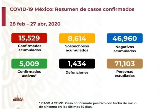 José Luis Alomía Zegarra, director general de Epidemiología de la Secretaría de Salud, informó que, hasta la noche de este lunes, México sumó 15 mil 529 casos confirmados de COVID-19 y mil 434 decesos a causa del virus.Los casos sospechosos acumulados sumaron ocho mil 614 casos y cinco mil nueve casos en etapa activa. Hasta el momento, 71 mil 103 personas han sido analizadas.En el informe diario de COVID-19, Alomía informó que 137 decesos son sospechosos del virus y las entidades que mantienen la mayor cantidad de muertes son la Ciudad de México y Baja California.Los estados con menor casos confirmados son Durango y Colima, mientras que las entidades con más casos siguen siendo la Ciudad de México y el Estado de México. La tasa de incidencia para todo el país se mantiene en 3.91 % para todo el país, según informó Alomía Zegarra.Hasta este domingo, la Secretaría de Salud (Ssa) había reportado 14 mil 677 contagios y mil 351 muertos. Además, este lunes se dio a conocer que la secretaria de la Función Pública (SFP), Irma Eréndira Sandoval, dio positivo a este virus.Por su parte, la Organización Mundial de la Salud (OMS) advirtió que aún la pandemia por el COVID-19 "está lejos de terminar", pues hay casos y muertes sin reportar en muchos países.JM