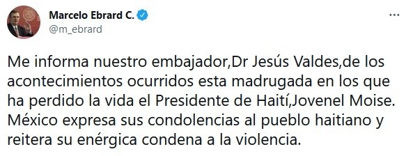 El secretario de Relaciones Exteriores, Marcelo Ebrard Casaubón condenó el asesinato del presidente de Haití, Jovenel Moïse.A través de sus redes sociales, Ebrard Casaubón detalló que el embajador de México en Haití, Jesús Valdés, le informó sobre los acontecimientos que sucedieron durante la madrugada de este miércoles."Me informa nuestro embajador, Dr Jesús Valdes, de los acontecimientos ocurridos esta madrugada en los que ha perdido la vida el Presidente de Haití, Jovenel Moise. México expresa sus condolencias al pueblo haitiano y reitera su enérgica condena a la violencia", escribió en su cuenta de Twitter.La madrugada de este miércoles, el presidente de Haití, Jovenel Moïse, fue asesinado luego de que un grupo de personas no identificadas atacaran su residencia privada, según informó el primer ministro interino del país.El Presidente Andrés Manuel López Obrador (AMLO) lamentó el asesinato del presidente de Haití, Jovenel Moïse, y la agresión con arma de fuego de su esposa Martine Moïse, en su domicilio de Puerto Príncipe."Enviar un abrazo al pueblo de Haití por el lamentable asesinato del presidente de Haití Moïse y de su esposa", dijo AMLO.En su conferencia de prensa, en Palacio Nacional, López Obrador recordó que el presidente de Haití estuvo en el acto de toma de posesión cuando asumió la Presidencia de México el 1 de diciembre de 2018."Vino con su esposa y le rendimos un homenaje, el pueblo y el gobierno de México".El Presidente López Obrador recordó que México está por enviar 150 mil dosis de vacunas en Haití que es un pueblo pobre necesita de la ayuda internacional.OA
