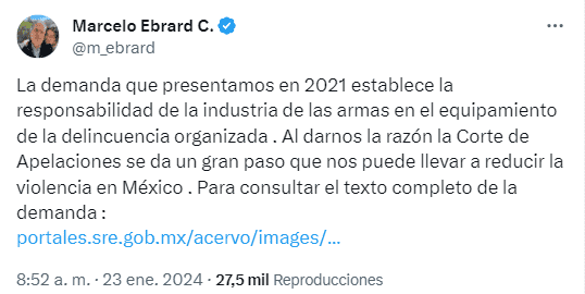 Este martes 23 de enero, el excanciller Marcelo Ebrard compartió la demanda que presentó en el año 2021 ante una Corte Federal en Boston, de Estados Unidos, la cual señala a 11 compañías productoras y distribuidoras de armas de promover prácticas comerciales "negligentes" e "ilícitas", que facilitan el tráfico ilegal de armas a México.En la querella, la cancillería mexicana recuerda que las armerías norteamericanas tienen la obligación de distribuir sus armas "de manera segura y de evitar armar a criminales en México".También señala que los demandados tienen el deber de monitorear y supervisar cuidadosamente a sus distribuidores y concesionarios: "Los demandados tienen el deber de vender armas de forma responsable, tienen el deber de no abastecer el mercado criminal en México, tienen el deber de diseñar armas seguras, tienen el deber de abstenerse de usar publicidad incendiaria e imprudente que pueda atraer a usuarios criminales, y no pueden eludir sus obligaciones ignorando voluntariamente los hechos".Puntualiza que cada año se trafican ilegalmente más de 500 mil armas desde EU y, solo en 2019, fueron responsables de más de 17 mil homicidios dolosos en México.La demanda sostiene que las armerías de Estados Unidos "son plenamente conscientes de que su conducta provoca el tráfico ilícito hacia México", afirma que los demandados "ayudan y facilitan activamente el tráfico de sus armas a los cárteles de la droga en México".En el texto, la cancillería también advierte que las empresas norteamericanas diseñan sus armas de estilo militar e incluso las publicitan como armas de asalto de estilo militar: "Los Demandados saben que sus armas de estilo militar son las armas preferidas de los cárteles", por lo que "la comercialización imprudente de las mismas es ilegal.Finalmente, se advierte que "los demandados causan un daño masivo al gobierno" pues "han inundado a México con sus armas", lo que ha generado en nuestro país "muerte", "destrucción", y "daño económico".En su pliego petitorio, el Gobierno de México exige respetuosamente al Tribunal que dicte sentencias conjuntas y solidarias contra los demandados y a favor de México, que adopte medidas cautelares y de equidad contra los demandados, exigiéndoles que: "Reduzcan y remedien la molestia pública que han creado en México", "creen e implementen estándares suficientes para monitorear y disciplinar razonablemente sus sistemas de distribución", "incorporen todos los mecanismos de seguridad razonablemente disponibles en sus armas, incluyendo dispositivos que impidan el uso de esas armas por usuarios no autorizados", y "financien estudios, programas, campañas publicitarias y otros eventos centrados en prevenir el tráfico ilegal de armas".Adicionalmente, solicita una indemnización por daños y perjuicios al Gobierno "en una cantidad que se determinará en el juicio", pero estimada en más de 10 mil millones de dólares; conceder sanciones civiles al Gobierno, según lo permita la ley; conceder al Gobierno la restitución y la devolución de los beneficios de los Demandados; y conceder cualquier otra reparación adicional que el caso requiera, entre otras cosas.*Mantente al día con las noticias, únete a nuestro canal de WhatsAppOF