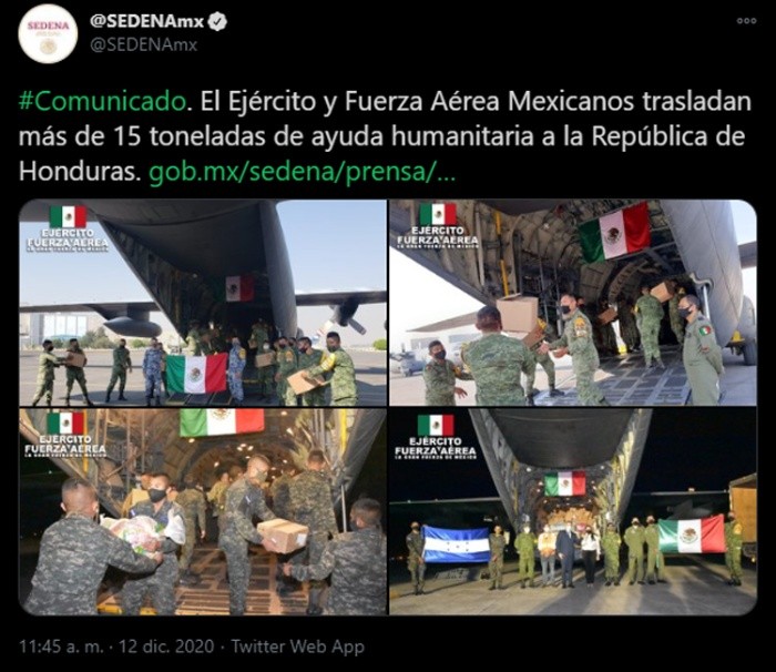 El Ejército y la Fuerza Aérea mexicanos trasladaron 15.2 toneladas de ayuda humanitaria a la República de Honduras, afectada por el paso de los huracanes "Eta" y "Iota", que dejaron cientos de damnificados en ese país centroamericano.Un avión "Hércules C", perteneciente a la Fuerza Aérea Mexicana, partió el viernes de la Base Militar No. 19, ubicada en la Ciudad de México, con destino a Honduras, informó la Secretaría de la Defensa Nacional.Indicó que el puente aéreo inició en las primeras horas del 11 de diciembre del 2020, con la aplicación de controles y medidas sanitarias correspondientes, con el objeto de evitar la propagación del virus COVID-19.En Honduras, el cargamento fue recibido por el encargado de Negocios de la Embajada de México en ese país, quien hizo entrega simbólica de la ayuda a la Vicecanciller de Cooperación y Promoción Internacional de Honduras, Karen Alejandra Najarro Bonilla.La Sedena señaló que esta acción se suma a las distintas muestras de apoyo y solidaridad de México para con el pueblo de Honduras, las cuales han sido una constante en la historia de ambos países, particularmente cuando en 1998 el huracán Mitch, una de las tormentas tropicales más violentas del siglo pasado, azotó a ese país Centroamérica.OF