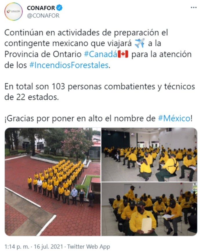 Por cuarta ocasión, el Gobierno de México, a través de la Comisión Nacional Forestal (Conafor) envió un contingente de personal combatiente que ayudará en la supresión de incendios forestales en Canadá, conformado por 101 personas.El contingente mexicano, que en esta ocasión trabajará en la provincia de Ontario, está conformado por cinco brigadas, cinco jefes de brigada, 20 jefes de cuadrilla, dos representantes de la dependencia en campo, un coordinador COVID y el resto como personal combatiente de línea, quienes hacen un total de 101 personas.El personal, señaló la Conafor, procede de 22 entidades del país: Aguascalientes, Campeche, Chiapas, Ciudad de México, Coahuila, Colima, Durango, Guanajuato, Guerrero, Hidalgo, Jalisco, Estado de México, Michoacán, Morelos, Nayarit, Puebla, San Luis Potosí, Tamaulipas, Tlaxcala, Veracruz y Yucatán. "Todos ellos, cumplen con los requisitos y estándares solicitados por Canadá ya que completaron su registro en la plataforma en línea del Sistema de Selección de Combatientes de Incendios Forestales para Despliegues Internacionales (SISECOIF) 2021 y acreditaron satisfactoriamente la fase de evaluaciones presenciales de aptitud física y conocimientos en materia de incendios forestales", precisó.Además, dijo que de la concentración de las 101 personas seleccionadas; tres de ellas mujeres, se llevó a cabo del 15 al 17 de julio en las oficinas centrales de la Conafor, ubicadas en Zapopan, Jalisco donde terminaron algunas otras actividades como el pesaje de equipaje, revisión médica, prueba de COVID-19, revisión de equipo personal de protección, entre algunas otras."Este contingente es enviado por el gobierno mexicano a solicitud de Canadá, y responde a la estadística del Centro Canadiense Interagencias de Incendios Forestales (CIFFC), que cataloga la situación actual en ese país como crítica, por lo que se declaró un nivel 5 de preparación nacional", comentó en un comunicado.Recordó que la clasificación de los niveles de preparación es establecida de acuerdo con las condiciones climáticas, cantidad de vegetación que pueda arder (combustibles), pronóstico de comportamiento del fuego y la disponibilidad de recursos nacionales para la supresión de incendios, siendo el número cinco el nivel más alto en una escala 1-5, por lo que se considera al Nivel 5 como el más alto.Añadió que el contingente mexicano arribó el 17 de julio al Aeropuerto Internacional Pearson de Toronto y donde fue recibido por una comitiva encabezada del lado mexicano por el embajador de México en Canadá, Juan José Gómez Camacho y el cónsul general de Toronto, Porfirio Thierry Muñoz Ledo.OF