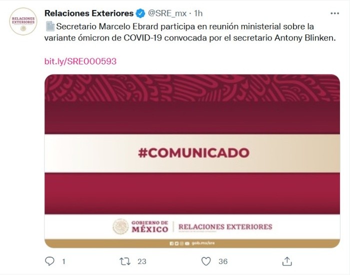 El canciller Marcelo Ebrard dijo este martes que México no plantea aplicar restricciones de viajes al intervenir durante una reunión telemática convocada por el secretario de Estado de Estados Unidos, Antony Blinken, sobre la variable ómicron del coronavirus.La Secretaría de Relaciones Exteriores (SRE) informó en un comunicado que Ebrard explicó que "México está trabajando en un plan de vacunación de refuerzo para la población elegible y que no se planea imponer, hasta el momento, restricciones a los viajes nacionales".Además, instó a los representantes de 17 países a "mantener un mensaje de prevención y vacunación".Por su parte, Blinken dio a conocer la intención del Gobierno de Estados Unidos de sostener una nueva reunión ministerial a principios del próximo año.El secretario de Estado subrayó la necesidad del "fortalecimiento de las cadenas de suministro" de material médico, la "aceptación de distintos tipos de vacunas" contra el coronavirus y el objetivo de haber vacunado al 70 % de la población mundial a finales de 2022.Según la SRE, en el encuentro participaron ministros y representantes de Alemania, Arabia Saudí, Australia, Botsuana, Canadá, China, India, Israel, Japón, Malaui, Mozambique, Sudáfrica, República de Corea, Reino Unido, la Unión Europea y la Unión Africana, así como diplomáticos de otros países.JM