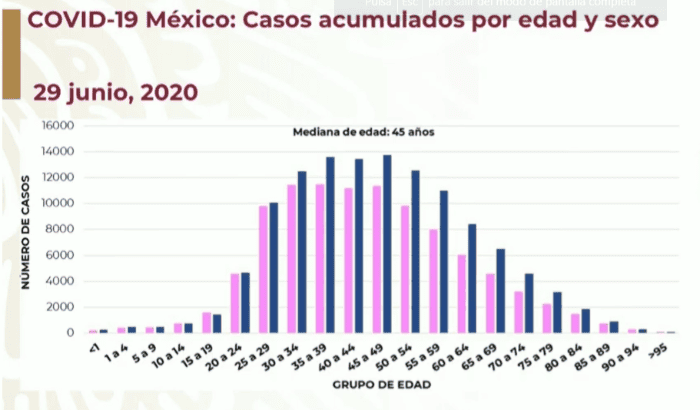 A 29 días del inicio de la "nueva normalidad" y con 18 estados de la República en color naranja del semáforo de riesgo, suman 220 mil 657 casos positivos de COVID-19 en México, de los cuales 23 mil 389 casos se encuentran activos, es decir que tuvieron fecha de inicio de síntomas en los últimos 14 días.La Secretaría de Salud federal informa en su conferencia vespertina que a la fecha suman 27 mil 121 personas fallecidas a causa de la enfermedad causada por el coronavirus.En las últimas 24 horas se registraron tres mil 805 casos nuevos de COVID-19 en México, lo que representa el menor crecimiento porcentual día a día durante la pandemia en el país, aunque advierten, no representa aún una tendencia a la baja.Sobre la ocupación hospitalaria, se reporta que a nivel nacional se encuentra en un 44%, lo que significa que habría más de 14 mil camas disponibles para pacientes graves; en tanto que para pacientes críticos las camas con asistencia respiratoria están en 39%, que representa cinco mil 447 espacios disponibles a nivel nacional.Durante la conferencia vespertina sobre coronavirus COVID-19 en México, se recordó que a partir de este lunes algunas entidades como Ciudad de México y Jalisco pasaron al nivel Naranja en el semáforo de riesgo donde se permiten algunas actividades comerciales como la operación de hoteles y restaurantes a un 50 por ciento de ocupación, así como parques públicos; sin embargo eventos masivos, bares y centros nocturnos deben continuar cerrados.En la conferencia vespertina de este lunes, se presentaron detalles sobre la estadística y demografía de los casos positivos de COVID-19, sin variaciones considerables respecto a reportes previos."La mayor carga de casos confirmados está entre los 35 y los 49 años de edad (...) el 55% de ellos han sido hombres, es decir, un poco más de la mitad", explicó el doctor José Luis Alomía.Acerca de las personas fallecidas, los grupos de edad con más incidencia son aquellos a partir de los 55 y hasta los 69 años.En cuanto a las comorbilidades siguen siendo hipertensión, diabetes y obesidad, los padecimientos más frecuentes entre quienes han perdido la vida.