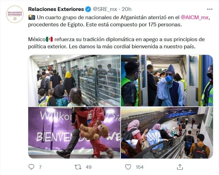 México recibió un grupo de 175 afganos, entre los que se encuentran trabajadores de medios, activistas y periodistas independientes, junto a sus familiares, que huyeron luego de que los talibanes tomaran el control del país asiático, anunció el miércoles la Secretaría de Relaciones Exteriores (SRE).El nuevo grupo de refugiados, entre los que se incluyen 75 menores de edad, es el cuarto que recibe el país y arribó el martes al Aeropuerto Internacional de la Ciudad de México en un vuelo de Egypt Air, señaló en un comunicado la SRE.Las embajadas de México en Egipto, Irán y los Emiratos Árabes Unidos, así como el gobierno egipcio, colaboraron para el viaje del nuevo grupo de afganos. El Gobierno mexicano ha recibido por razones humanitarias en la última semana a un total 391 refugiados.La SRE dijo que espera en los próximos días que lleguen al país otros grupos de ciudadanos afganos.Mientras el gobierno del Presidente Andrés Manuel López Obrador (AMLO) ha endurecido en los últimos meses las políticas de recepción de miles de migrantes centroamericanos, haitianos, cubanos y venezolanos que han ingresado al país con el objetivo de llegar a Estados Unidos, en el caso de los afganos se anunció que se concedería el asilo político a todos los que lo requirieran.Si te interesó esta noticia y quieres saber más, entonces descarga y descubre INFORMAPlus, la aplicación digital de EL INFORMADOR, en donde tenemos contenidos exclusivos, seleccionados por nuestros editores, para darles una experiencia más completa a los lectores. Si eres suscriptor de EL INFORMADOR tu acceso está incluido, solicítalo al 33 3678-7777Descarga la aplicación y pruébala GRATIS por treinta días.Para iOS: https://apple.co/35jaVgbPara Android: https://bit.ly/3gwVSEVJM