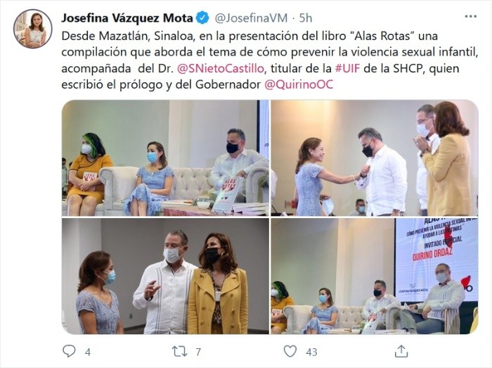La senadora del Partido Acción Nacional, Josefina Vázquez Mota, citó que México ocupa el segundo lugar en el mundo en turismo sexual infantil, sólo por debajo de Tailandia, por lo que se requiere redoblar esfuerzos en su combate mediante un pacto con el sector turístico.Al presentar su libro "Alas Rotas" en el puerto de Mazatlán, en compañía del gobernador Quirino Ordaz Coppel y del titular de la Unidad de Inteligencia Financiera, Santiago Nieto, reseñó que su libro narra la historia de vida de poco más de cinco millones de niños y niñas que son víctimas del crimen y la violencia sexual.Vázquez Mota resaltó que nuestro país es el que aporta más pornografía infantil en el mundo, pues 70% de lo que se observa se produce en México; asimismo, puntualizó que fue pertinente la presentación de este libro desde Mazatlán, puesto que los destinos turísticos en el país tienen que contribuir en un pacto para combatir esta cadena de crímenes que se cometen con la infancia.Durante el evento, en el que estuvieron presentes los senadores de Morena, Rubén Rocha Moya y Mario Zamora Gastélum, del Partido Revolucionario Institucional, indicó que se tienen que suman esfuerzos para eliminar el turismo sexual infantil.En su participación, el gobernador del estado hizo ver que el abuso sexual infantil y la prostitución obligada de menores de edad, así como la pornografía infantil, están catalogados como el segundo delito en ganancias, después del narcotráfico.En el evento, Quirino Ordaz aprovechó para agradecer a Santiago Nieto la designación en Sinaloa de una Unidad de Inteligencia Financiera propia del estado, en la que se suma política la científica especializada para la investigación de delitos en el ciberespacio que es donde se registra el mayor caso menores de edad engañados.JM