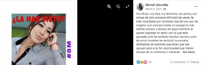 Michelle Pérez Tadeo era originaria de Veracruz y se desempeñaba como modelo, actriz y conductora de deportes bajo el pseudónimo de Michell Simon.Hace tres días, fue reportada como desaparecida y el 21 de febrero su cuerpo fue encontrado semidesnudo, envuelto en sábanas de un motel. Tenía huellas de violencia y fue arrojado en la carretera Picacho-Ajusco, en la delegación de Tlalpan, a la altura del kilómetro 32, de acuerdo con el periodista Carlos Jiménez.La joven de 29 años emigró en 2013 de Coatzacoalcos a la Ciudad de México para cumplir su sueño como conductora de deportes. Y cada día le aterraba morir violentada.En un mensaje que expuso el 09 de marzo de 2020 en su cuenta de Facebook, la conductora expresó su temor por ser una víctima más de feminicidio:"Las mujeres que conozco todas sin excepción han sufrido acosos, y abusos de algún hombre, al querer expresar mi sentir con lo que está pasando sólo he recibido insultos, burlas y odio de otros hombres he recibido la empatía disfrazada de hombres que dicen que nos apoyan pero a la 1er oportunidad que tienen abusan de tu confianza o vulnerabilidad, me han llamado feminazi por defender y apoyar la idea de querer salvar mi vida, por estar aterrada de pensar si soy la siguiente, o si será mi madre, mi prima, mi amiga, me aterra pensar que día a día estamos expuestas a ser violadas o a morir", escribió.En su texto, la veracruzana indicaba que al usar el transporte público "moría de miedo" por el constante acoso."No puedo vestirme como me gusta si no voy en auto o si no estaré en un lugar "seguro" me preocupa cuando mi mamá, prima, o amiga no responde el teléfono, hombres no los odio, no estoy en contra de ustedes sé que hay hombres que realmente nos apoyan, simplemente no sienten terror a todo como nosotras y aunque muchos piensen que nos apoyan desde el momento de reírse, juzgar o llamarnos feminazis se nota su cero empatía".Con ese mensaje dijo que no esperaba cambiar la forma de pensar de los hombres "de nadie solo expreso lo que siento el porque me uno al paro pero sobre todo me aterra aparecer como en la siguiente foto y si soy yo la siguiente, quiero ser la última", sostuvo Michell.JM