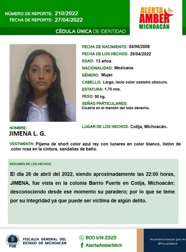 Jimena, la niña de 13 años de edad que desapareció el pasado 26 de abril en el municipio de Cotija, Michoacán, fue sacada de su casa con amenazas y extorsión. Se desconoce su paradero.Gloria García Magaña, madre de la menor, explicó que su hija salió de su casa entre 11 y 12 de la noche, en ese lugar ubicado en el llamado "corredor de la muerte".Cuenta que Jimena salió de su casa por amenazas y extorsión de una pareja de vecinos, lo cual supo a través de unas cartas que encontró en las pertenencias de la niña."Amenazas muy fuertes, de extorsión de dinero y amenazada. La carta dice que si no se brincaba, que si no salía, ella sabía lo que iba a pasar. Qué más muertos no", revela.García Magaña, dijo que al presentar la denuncia, entregó todas las pruebas que incriminan al matrimonio involucrado en la desaparición de su hija."Citaron a la sospechosa, pero no me dicen nada. No tuve ninguna respuesta; no pudieron hacer hablar a la sospechosa, que ya está en su casa", contó.Dice que la mujer vive a tres casas de la suya "y ahí la vi sentada, y todavía riéndose", narra Gloria García, entre llantos de los demás familiares.Los padres de Jimena, demás familiares y amigos, cerraron la carretera Cotija-Jacona para presionar a las autoridades, buscar a su hija y a detener a los responsables.La alcaldesa de Cotija, Yolanda Sánchez Figueroa, anunció la suspensión del festival del "Día del Niño" que se iba a realizar este sábado, dijo, por respeto a Jimena y a su familia.Expuso que antes de ser presidenta municipal es mujer y madre de familia, por lo que su policía local inició la búsqueda de la niña.Anunció que ya también pidió el apoyo del gobierno estatal y de la Federación para reforzar la búsqueda de Jimena.El cierre carretero fue liberado por los familiares y amigos de Jimena, quienes marcharon por las principales calles de ese municipio ubicado en el corredor de la muerte.Amenazaron que si no tienen alguna respuesta de las autoridades o no aparece su hija en las próximas horas, volverán a bloquear la carretera de manera indefinida.OA