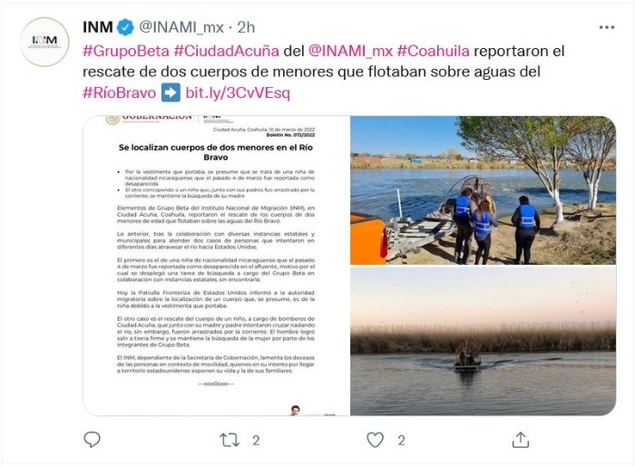 Los cuerpos de dos menores de edad, uno probablemente de una niña de nacionalidad nicaragüense, fueron recuperados en aguas del río Bravo, que divide a México y Estados Unidos, informó este jueves el Instituto Nacional de Migración (INM).En un comunicado, el INM señaló que en el caso de la menor se infirió que es originaria de Nicaragua "por la vestimenta que portaba" y recordó que el pasado 4 de marzo fue reportada como desaparecida en el afluente.Mientras que del otro cuerpo indicó que corresponde a un niño que junto con sus padres fue arrastrado por la corriente, y explicó que "se mantiene la búsqueda de su madre".Agentes del Grupo Beta, unidad del INM especializada en brindar orientación y asistencia a migrantes de Ciudad Acuña, Coahuila, reportaron el rescate de los cuerpos de dos menores de edad que flotaban sobre las aguas del Río Bravo, según la nota.Esto, tras la colaboración de diversas instancias estatales y municipales "para atender dos casos de personas que intentaron en diferentes días atravesar el río hacia Estados Unidos".El INM fue informado por la Patrulla Fronteriza de Estados Unidos sobre la localización de los dos cuerpos.México interceptó a 73 mil 034 migrantes sólo en lo que va del añoEn el caso del cuerpo del niño, el rescate estuvo a cargo del cuerpo de bomberos de Ciudad Acuña, y señalaron que junto con su madre y padre intentaron cruzar nadando el río; sin embargo, fueron arrastrados por la corriente."El hombre logró salir a tierra firme y se mantiene la búsqueda de la mujer por parte del Grupo Beta", se indicó en el comunicado.JM
