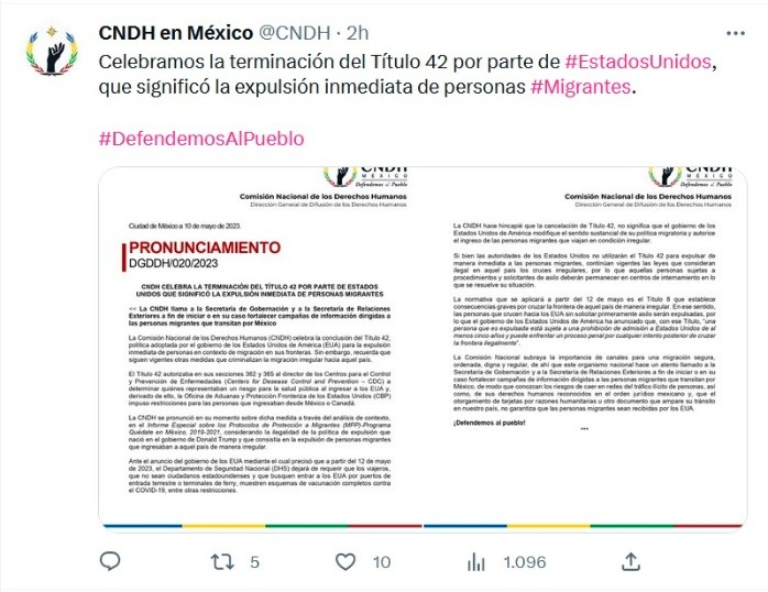 La Comisión Nacional de Derechos Humanos (CNDH) celebró este miércoles el fin del Título 42 de Estados Unidos este próximo 11 de mayo, pero recordó que aún hay otras medidas que criminalizan a los migrantes."La CNDH celebra la conclusión del Título 42, política adoptada por el Gobierno de los Estados Unidos de América para la expulsión inmediata de personas en contexto de migración en sus fronteras. Sin embargo, recuerda que siguen vigentes otras medidas que criminalizan la migración irregular hacia aquel país", expuso en un comunicado.El organismo recordó que el Título 42, en vigor desde la presidencia de Donald Trump (2017-2021) autorizaba a los Centros para el Control y Prevención de Enfermedades (CDC, por sus siglas en inglés) a determinar quiénes representaban un riesgo para la salud pública al ingresar a EU.Esto derivó en restricciones para quienes ingresaban desde México o Canadá y la expulsión inmediata de migrantes que entraban al país de manera irregular, por lo que el organismo se pronunció en su momento contra dicha medida al considerarla ilegal.La CNDH enfatizó que la cancelación del Título 42 no significa que el Gobierno estadounidense modificará el sentido sustancial de su política migratoria y autorizará el ingreso de migrantes que viajan de forma irregular.Si bien los migrantes no serán expulsados de manera inmediata como lo dictaba dicha política, la CNDH advirtió que "continúan vigentes las leyes que consideran ilegal en aquel país los cruces irregulares".Además, precisó que a partir del 12 de mayo se aplicará la normativa Título 8, que establece consecuencias graves por cruzar la frontera, por lo que migrantes afrontaron la expulsión o un proceso penal."Una persona que es expulsada está sujeta a una prohibición de admisión a Estados Unidos de al menos cinco años y puede enfrentar un proceso penal por cualquier intento posterior de cruzar la frontera ilegalmente", advirtió.Es por ello que la CNDH pidió a la Secretaría de Gobernación y a la Secretaría de Relaciones Exteriores de México realizar campañas de información dirigidas a migrantes que transitan por México.El objetivo, dijo, es que las personas extranjeras conozcan los riesgos de caer en redes del tráfico ilícito de personas, así como, de sus derechos humanos.JM