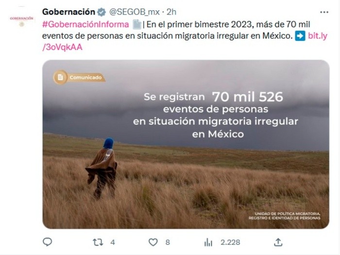 Durante el primer bimestre de 2023 se registraron 70 mil 526 eventos de personas en situación migratoria irregular en México, lo que representa un incremento de 22 mil 840, equivalente al 47.9 por ciento, en comparación con el mismo periodo de 2022, que registró 47 mil 686 eventos.De acuerdo con la actualización de la infografía “Eventos de personas en situación migratoria irregular en México, enero-febrero 2023”, de la Unidad de Política Migratoria, Registro e Identidad de Personas (UPMRIP) de la Secretaría de Gobernación (Segob) del total registrado, 46 mil 945 fueron hombres y 23 mil 581 mujeres.Las principales entidades federativas en donde se llevó a cabo la detección de dichos migrantes extranjeros son Chiapas, con 29 mil 143; Tabasco, seis mil 578; y Coahuila, seis mil 223; y el resto corresponde a diversas entidades.La Segob destacó que de la población en situación migratoria irregular, 28 mil 922 son originarios de Sudamérica, principalmente de Ecuador (12 mil 058) y Venezuela (11 mil 645).Del total de personas extranjeras que se internaron a México de manera irregular, 45 mil 015 fueron presentadas y 25 mil 511 canalizadas por la autoridad migratoria en el país.La Segob precisó que 13 mil 506 canalizaciones fueron de niñas, niños o adolescentes; de los cuales 12 mil 279 corresponde a menores acompañados, mil 227 a no acompañados y 12 mil 005 a los adultos acompañantes.Lo anterior, se desprende de los eventos se refieren a que una misma persona puede ser presentada y/o canalizada más de una vez en un periodo determinado.JM