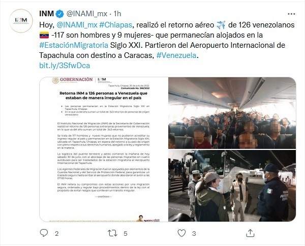 El Instituto Nacional de Migración (INM) realizó el retorno de 126 personas extranjeras provenientes de Venezuela, en lo que va del año suman un total de 343 deportaciones.Cabe destacar que Venezuela vive un masivo éxodo de su población a partir de los gobiernos de Hugo Chávez y Nicolás Maduro. Se calcula que tres millones de personas de ese país han emigrado principalmente a Colombia, Brasil, Ecuador, Perú y Estados Unidos.El INM informó en un boletín que se trata de 117 hombres y nueve mujeres que no pudieron acreditar su ingreso regular en el país y permanecían en la Estación Migratoria Siglo XXI, ubicada en Tapachula, Chiapas, en espera del retorno a su país de origen con pleno respeto a sus derechos humanos, apegado a la ley y reglamento en la materia.La logística del puente terrestre y aéreo comenzó la mañana de este sábado, con el abordaje de las personas migrantes en cuatro autobuses para ser trasladadas de la estación migratoria al Aeropuerto Internacional de Tapachula.Los Agentes Federales de Migración fueron apoyados por elementos de la Guardia Nacional y del Servicio de Protección Federal, para garantizar un traslado seguro hasta arribar al aeropuerto donde abordaron el avión a las 07:00 horas.JM