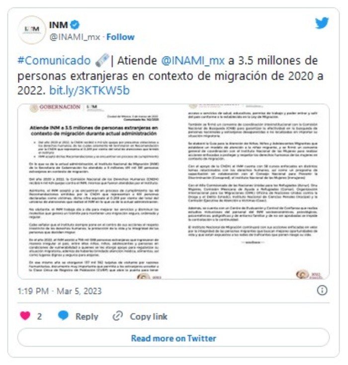 En lo que va de la actual administración, el Instituto Nacional de Migración (INM) ha atendido a tres millones 491 mil 381 personas extranjeras en contexto de migración; además, de 2020 a 2022, la Comisión Nacional de los Derechos Humanos (CNDH) recibió cuatro mil 424 quejas contra el INM, mismas que fueron atendidas por el Instituto.El organismo de la Secretaría de Gobernación (Segob) informó que aceptó y se encuentran en proceso de cumplimiento las 48 recomendaciones emitidas por la CNDH que representan a 661 personas declaradas como víctimas; dicha cifra equivale al 0.269 por ciento del total del universo de atenciones que realizó el INM en lo que va de la actual administración.En 2022, el INM asistió a 756 mil 088 personas extranjeras que ingresaron de manera irregular al país, entre ellas niñas, niños, adolescentes y personas en condiciones de vulnerabilidad a quienes se les otorgó apoyo para regularizar su situación migratoria; además de haberles brindado atención médica, alimentos, así como lugares dignos y seguros para alojarse.En ese mismo año se otorgaron 137 mil 362 tarjetas de visitante por razones humanitarias, documento que permite a los extranjeros acceder a la Clave Única de Registro de Población (CURP), que abre la puerta para tener acceso a servicios de salud, educativos, permiso de trabajo y poder entrar y salir del país conforme a lo establecido en la Ley de Migración.También se firmó un convenio de coordinación interinstitucional con la Comisión Nacional de Búsqueda de Personas Desaparecidas (CNB) para garantizar la efectividad en la búsqueda de personas nacionales y extranjeras desaparecidas o no localizadas sin importar su situación migratoria.El INM apuntó que se elaboró la Guía para la Atención de Niñas, Niños y Adolescentes Migrantes que establece un modelo de atención a la niñez migrante, y se firmó un convenio general de coordinación con el Instituto Nacional de las Mujeres (Inmujeres) para realizar acciones enfocadas a proteger y respetar los derechos humanos de las mujeres en contexto de migración.El Instituto Nacional de Migración afirmó que continuará con sus acciones enfocadas en velar por la integridad de las personas migrantes que buscan mejores oportunidades de vida y que están expuestos a las redes de traficantes que ponen riesgo su vida.JM