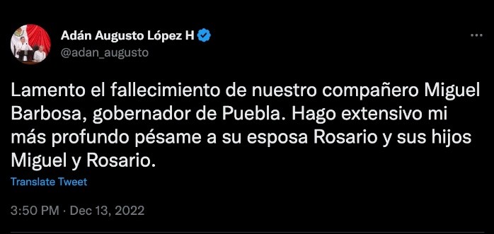 La tarde de este martes se reportó el fallecimiento del gobernador de Puebla, Miguel Barbosa, quien mañana rendiría su cuarto informe de gobierno ante el Congreso de Puebla.Tras su muerte, diferentes políticos y personajes han ofrecido sus condolencias. También el gobernador de Jaliscolamentó la muerte del mandatario: Barbosa fue presidente del Senado y esta tarde el pleno de la Cámara Alta guardó un minuto de silencio y un minuto de aplausos en su honor.