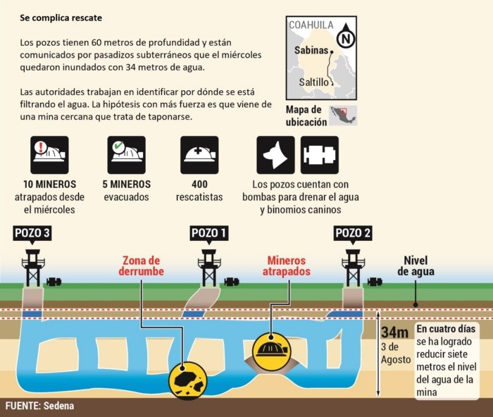 La desesperación de los familiares de los 10 mineros que están atrapados desde el miércoles pasado en una mina de carbón en Sabinas, Coahuila, creció mientras las autoridades aceleraron los esfuerzos para taponar las filtraciones de agua y así bajar con más rapidez el nivel de inundación de los pozos, de modo que pudieran entrar los buzos de rescate.Por la mañana, el Presidente Andrés Manuel López Obrador (AMLO) adelantó que ayer sería “un día decisivo porque, según los técnicos, se sabrá si hay posibilidad de que entren sin riesgo los buzos”.Sin embargo, al caer la noche, la única información oficial que trascendió, proporcionada por Protección Civil federal, fue que habían introducido una cámara por uno de los pozos para ver las condiciones existentes en el interior. Los trabajadores quedaron atrapados cuando la mina se derrumbó. Se toparon con un área contigua llena de agua que al venirse abajo provocó la inundación de tres pozos.De los 15 mineros que trabajaban en el momento del derrumbe, solamente cinco lograron salir y alertar a las autoridades.Aunque la posibilidad de encontrarlos vivos parece cada vez más remota, los familiares se aferran a los comentarios de algunos de los supervivientes y no pierden la esperanza.“Los que alcanzaron a subir y conocen el terreno dijeron que había una bolsa de aire en (una zona llamada) La Campana. Si (el agua) los arrastró para el lado de La Campana, hay esperanza”, dijo el viernes por la noche Blanca Rivera, que tiene dos primos en la mina.Al crecer la desesperación, algunos como Santiago Cecilio Moreno -con su hermano y su sobrino atrapados- intentaron dar ánimos al resto y se mostraron dispuestos a bajar con los buzos y ayudar al rescate.El gobernador de Coahuila, Miguel Riquelme Solís, acentuó que no pueden hacer nada en cuanto al rescate de los mineros atrapados hasta que saquen el agua y pongan un tapón en la filtración.“El tiempo nos va comiendo”, reconoció el mandatario estatal.