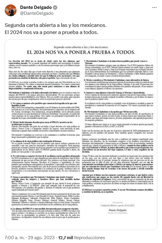 El senador y presidente del partido Movimiento Ciudadano, Dante Delgado, publicó este martes la segunda carta abierta a las y los mexicanos en la que reitera que su partido irá solo en el proceso electoral del 2024."La elección del 2024 no se trata de elegir entre las dos alianzas que representan el pasado. No se puede impulsar un cambio real recorriendo el mismo camino, con los mismos partidos y con los mismos personajes que ya faltaron al país durante una y otra vez", dijo.En la misiva, el líder nacional de MC asegura que no existe una sola razón para sumarse a una alianza de impresentables y condenada al fracaso y expuso 10 razones por las que competirán solos en el próximo proceso electoral:"Estas son las razones por las que en el proceso electoral del 2024 participaremos sin alianzas de los partidos del pasado", aseguró.Finalmente, compartió sus razones personales para no ir en alianza, como el dejar a México en manos de nuevas generaciones que no cometan los errores del pasado."Apostar por el futuro nos ha expuesto a presiones externas, sé que habrá costos que tendremos que pagar, no me asusta. He pagado hasta con la libertad la decisión de enfrentar al régimen", concluyó. OF