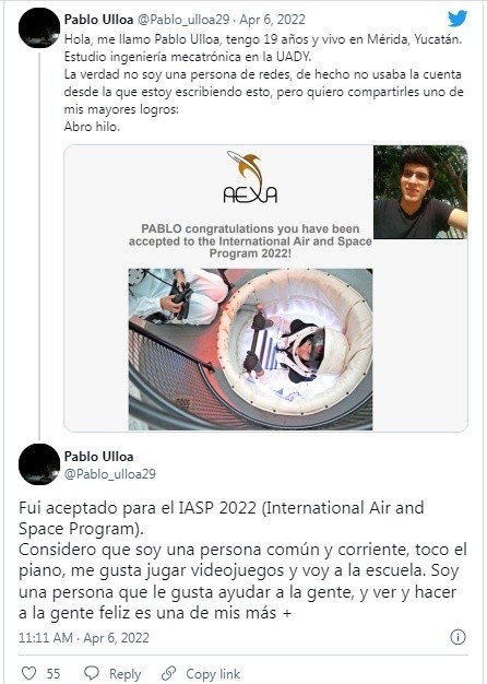 Un joven yucateco forma parte del selecto grupo de universitarios en el mundo que logró ser admitido en el Programa Internacional Aéreo y Espacial que organiza la NASA.Fue en su cuenta de Twitter, donde Pablo Ulloa, quien tiene 19 años de edad y es estudiante de la carrera de Mecatrónica de la Universidad Autónoma de Yucatán (Uady) compartió:"Estudio ingeniería mecatrónica en la Uady. La verdad no soy una persona de redes, de hecho, no usaba la cuenta desde la que estoy escribiendo esto, pero quiero compartirles uno de mis mayores logros".Pablo estudia el primer semestre de la carrera de Mecatrónica, y para ingresar al programa presentó un proyecto para usar la energía térmica de los cohetes al despegar para otros fines.Señaló que está tratando de reunir 80 mil pesos para poder viajar a Huntsville, Alabama. Por parte del Gobierno de Yucatán recibirá recursos para los boletos y el trámite de la VISA americana.Pero recurrió a su cuenta de redes para informar de su logro y que necesita reunir fondos para lograr su meta de ir a este proyecto de la NASA y participar representando a Yucatán y México.JM