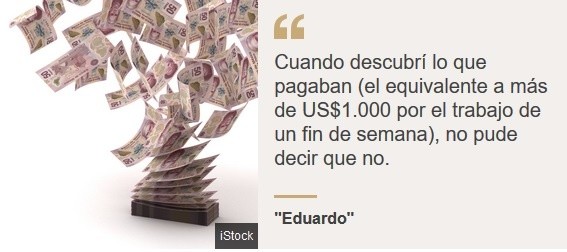 Eduardo*, 28 añosSi soy sincero conmigo mismo, supe para quién estaba realmente trabajando desde la primera vez que vi a mis jefes entrar a la oficina cargando enormes paquetes de dinero en efectivo.Puntuales como un reloj, todos los días, a las 3:00 pm 10 hombres aparecían con lo que debían haber sido millones y una empleada los llevaba al banco. Nadie nunca hizo preguntas.En ese momento me convencí de que lo que temía era verdad: estaba trabajando para un cartel de narcotraficantes.Siempre supe de los carteles, grupos del crimen organizado involucrados con el narcotráfico, incluso cuando era niño.Mientras crecía, en México, la amenaza que representaban estas bandas criminales similares a la mafia siempre estuvo en el trasfondo de la vida cotidiana.La mayoría de las veces, era posible bloquear los interminables informes de noticias o los rumores de asesinatos sangrientos.Pero cuando finalmente se metieron en mi vida, me preocupaba no poder escapar.Crecí en el tipo de lugar donde todos se conocen y las noticias viajan rápido.Y empecé a comprender mejor lo peligrosos que eran los carteles cuando tenía unos 15 años.Era 2006, y un nuevo presidente, Felipe Calderón, acababa de asumir el cargo. Llegó al poder con la promesa de restaurar "el estado de derecho" en México, librando una guerra sangrienta contra el narcotráfico. Recuerdo que estaba tan decidido a luchar contra los carteles que envió al ejército tras ellos.Fue presidente hasta 2012, pero la batalla continuó después de que dejó el cargo. Y desde 2006, más de 200,000 personas murieron o desaparecieron en México como resultado de la guerra contra las drogas.Los carteles comenzaron a dividirse en grupos más pequeños, extendiéndose desde las áreas que originalmente controlaban.Históricamente, gran parte del norte de México estaba controlada por el cartel de Sinaloa, liderado por El Chapo Guzmán, mientras que Los Zetas, un cartel formado por desertores del ejército, controlaban gran parte del este.Pero las áreas controladas cambiaron y se fragmentaron a medida que surgieron nuevos carteles y otros de dividieron. Se peleaban con AK-47 en el medio de la ciudad, nunca había visto algo así. Había personas que eran asesinadas y sus cuerpos arrojados a la calle.Recuerdo que cuando era adolescente una vez iba caminando por la ciudad y escuché disparos a lo lejos. Me dieron escalofríos. No vi el momento del asesinato, pero más tarde vi el cuerpo tirado en la calle. Fue la primera vez que vi algo así. Fue horrible y quedé profundamente conmocionado.Pero, lamentablemente, pronto se volvió normal.Es impactante para mí ahora recordar cómo esta brutal violencia se convirtió en parte de nuestras vidas.Algunas personas que conocía tenían miedo de iniciar negocios porque los miembros del cartel venían y trataban de extorsionarte. Si veían que usted tenía un negocio, como una tienda, venían y exigían una parte de las ganancias a cambio de "protección"; en otras palabras, "deme su dinero o lo mato".También los veía por ahí cuando salía de fiesta con mis amigos, cuando era adolescente. Por lo general, era un tipo grande con un montón de cadenas doradas, rodeado de mujeres hermosas, y yo me preguntaba qué lo hacía tan atractivo.Una vez, el compañero de uno de ellos me amenazó. Me acusó de agarrar un trago de la mesa del jefe y me dijo que no quería volver a verme. Estaba aterrorizado: salí corriendo del club con el corazón a mil.Cuando era niño, quería ser arqueólogo, porque me encanta la historia antigua, creo que inspirado por las películas de Indiana Jones.Pero cuando se trataba de elegir una carrera, me decidí por algo que pensé que me haría ganar más dinero: el marketing. Un amigo mío me consiguió un trabajo en una revista local y, en poco tiempo, me labré una reputación.Luego, un contacto que trabajaba para una agencia exitosa, cuyos clientes incluían restaurantes y bares propiedad de los carteles de la droga, me preguntó si quería un trabajo independiente para ayudarlos con sus materiales promocionales.Los carteles tienen que actuar como negocios normales para poder ocultar el dinero que ganan con actividades ilegales. Y cuando descubrí lo que pagaban (el equivalente a más de US$1.000 por el trabajo de un fin de semana), no pude decir que no.Eso es casi 25 mil pesos mexicanos y el salario mínimo en México es de 102 pesos por día.El dinero me atrajo. Tenía 21 años y comencé a presumir un montón, a vivir como una estrella de rock, a divertirme y a invitar a tragos a todos mis amigos.Sin embargo, no me fui de la casa de mis padres. No quería presumir demasiado, en caso de que la gente comenzara a hacer preguntas. Tenía mis sospechas en ese momento de que estas personas estaban involucradas con los carteles, pero no sentía que fuera parte de eso. Todo lo que estaba haciendo era ayudarlos a promocionar sus bares y restaurantes.Mis padres se preocuparon por mi estilo de vida y el tipo de personas para las que trabajaba. Me dijeron que tuviera cuidado pero, al principio, todo estuvo bien. No conocí a nadie del cartel, solo hacía mi trabajo y recibía mi dinero. Pero después de algunas semanas, uno de los jefes entró a la oficina.Inmediatamente tuve la sensación de que algo no estaba bien y que no podía confiar en él. Estaba vestido de pies a cabeza con ropa de diseñador y había llegado en un auto grande.A estos muchachos les encanta presumir y algunas personas piensan que son íconos de la moda. Cuando varios miembros del cártel fueron arrestados con una determinada camisa de polo de diseñador en 2010, todos querían esa camisa. Incluso hay un hashtag #narcofashion en Instagram.Y el jefe me preguntó si quería más trabajo y más dinero. Dijo que iba a comenzar a hacer shows con cantantes de corridos, que es un tipo popular de música popular mexicana, y quería que yo ayudara con la promoción.A veces, los capos de la droga hacen que estos cantantes